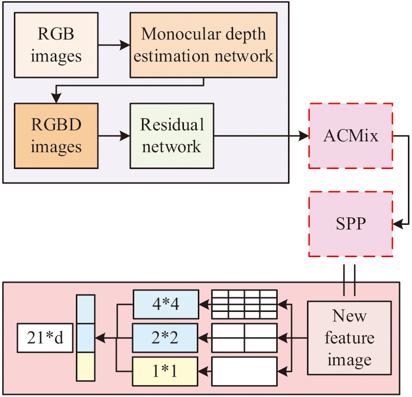 From Fig. 3, the first step is to use a monocular depth estimation network to process the RGB images captured by the drone camera. It obtains an RGBD image that combines the RGB image and depth estimation results. “D” represents depth information, which can provide three-dimensional position information of objects in the scene. Subsequently, residual networks are used to extract deep features of the image. ACMix combines convolutional networks and self-attention mechanisms to study the use of ACMix to capture long-distance dependencies between different regions in the initially obtained feature images, resulting in new multidimensional feature images. However, if the new multidimensional feature map is directly flattened into a one-dimensional vector input into the regression network, some important information in the spatial structure that affects the pose estimation of paper drones will be ignored due to the inability of one-dimensional vectors to preserve the spatial relationships and scale information in the original feature map [23,24]. Therefore, the study combines SPP to optimize the feature extraction network, as shown in Fig. 4.