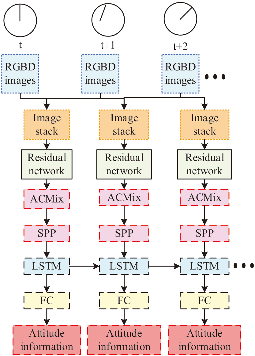 From Fig. 5, it can be seen that for each pose estimation, two frames of RGBD images at time t and time t+1 are selected, and the two RGBD images are stacked to form new image data, which is then processed through a feature extraction network. It is worth noting that the study incorporated Long Short-Term Memory (LSTM) into the pose network, which serves as a recurrent neural network for processing sequential data and can effectively learn the temporal information of input data. The output of LSTM is processed through a fully connected layer to obtain pose information. After calculating the poses at time t and time t+1, the network will receive the images at time t+1 and time t+2 as new inputs and repeat the above operation to achieve continuous pose estimation of the drone. In the process of pose estimation, traditional methods use Euler angles for estimation, but due to the fact that the universal joint lock can result in multiple different Euler angle representations of the same pose, it does not have uniqueness [26]. Therefore, the study uses quaternions to replace Euler angles, as shown in equation (6):