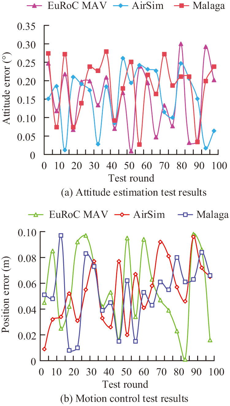 According to Fig. 8(a), in the three test sets, the average pose errors of the X, Y, and Z axes did not exceed 0.30 °. Among them, the EuRoC MAV dataset even had an error close to 0 ° in the 53rd test, and the AirSim dataset also had multiple tests approaching 0 °. As shown in Fig. 8(b), in the motion control test, the maximum error occurred during the 12th test on the Malaga dataset, with an average position error of 0.096 m. However, the error in all test results did not exceed 0.100 m. From this, after data augmentation dataset testing, pose estimation and motion control showed good performance in different test sets, with outstanding generalization ability.