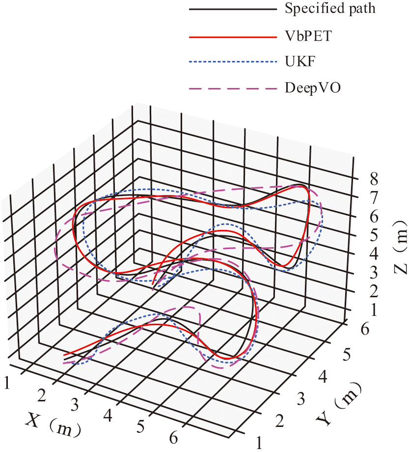 According to Table II, when using only the backbone network for monocular depth estimation, the E value was 9.46%, the P value was 83.48%, and the F1 was 84.37%. When adding ACMix on the basis of the backbone network without using SPP or adding SPP without using ACMix, the E value decreased and the P value and F1 increased. For method 4, which simultaneously incorporated ACMix and SPP, that is, the VbPET proposed in the study, the E value was reduced to 3.46%, the P value was increased to 97.46%, and the F1 value was increased to 97.53%. This indicated that the addition of ACMix and SPP could improve the performance of the network, and when combined with ACMix and SPP, the performance improvement was the most significant, verifying the effectiveness and superiority of VbPET. On this basis, the effectiveness and superiority of pose estimation based on VbPET were verified using paper drones in real scenarios. Unscented Kalman Filter (UKF) and Deep Visual Odometry (DeepVO) were selected as comparison algorithms, and the results are shown in Fig. 9.