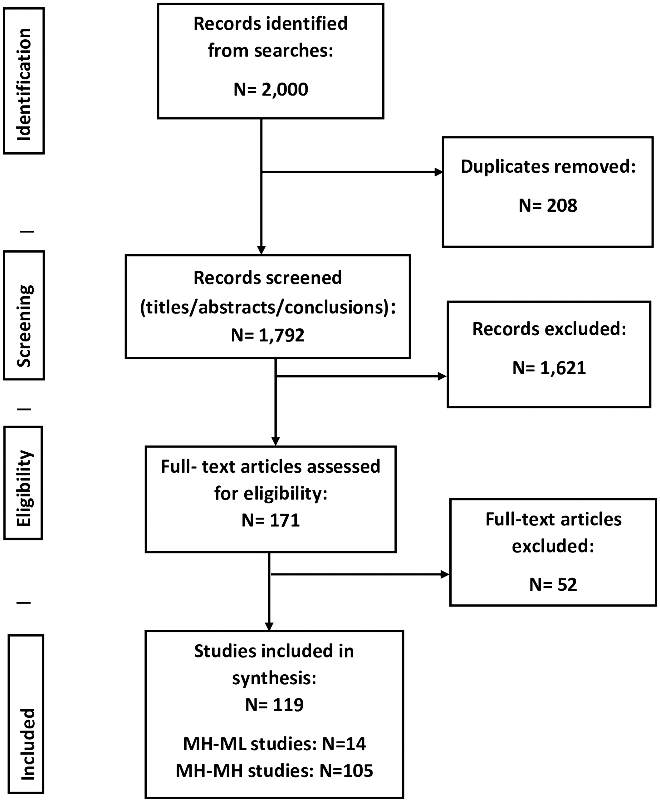 At the end of the process, 14 and 105 papers were obtained regarding MH-ML and MH-MH, respectively, for inclusion in the final synthesis, totaling 119. In this study, the term ‘new’ refers to MH-ML or MH-MH that first appear in the 2024 bibliometric dataset analyzed. This definition emphasizes publication emergence rather than algorithmic invention.