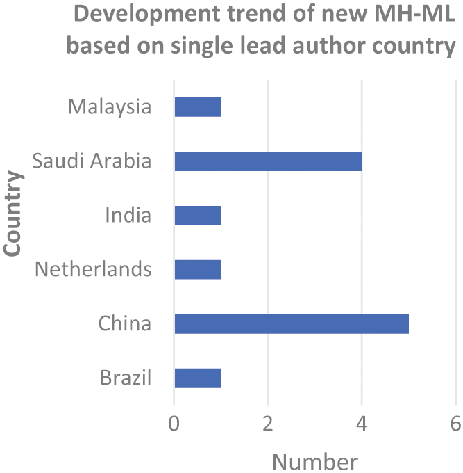 Figures 5 and 6 present the publication trends of lead authors from single and dual countries for MH-ML studies. Six countries were involved for single lead-author contributions. China emerged as the dominant country, contributing five studies. Saudi Arabia followed with four papers, while Brazil, the Netherlands, India, and Malaysia each produced one publication. Portugal and Egypt each had one study led by a single author.