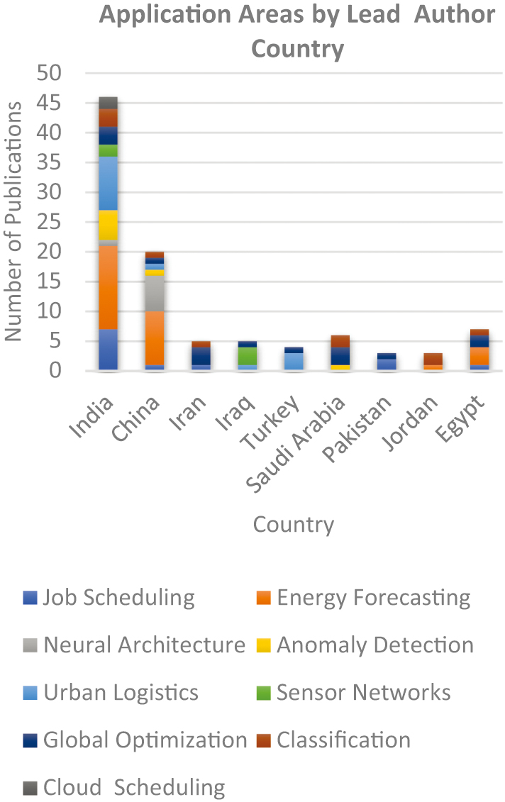 Figure 9 illustrates the application areas of hybrid MH research, focusing on the top nine lead-author countries. India led with 46 publications, primarily concentrated in energy forecasting (14), urban logistics (9), and job scheduling (7), reflecting the country’s emphasis on applied optimization research. This focus was linked to India’s digital transformation initiatives, such as Digital India and NITI Aayog’s AI Strategy, both of which promoted smart manufacturing and AI adoption [59].
