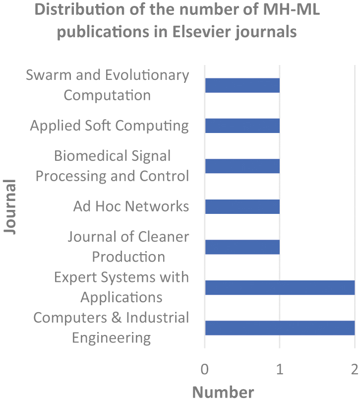 Figures 10 and 11 present the publication trends by publisher and leading journals for MH-ML, while Fig. 12 and 13 depict the same for MH-MH. For MH-ML, 14 publications emerged from Springer, Elsevier and IEEE. Elsevier recorded the highest count (nine), followed by Springer (four), and IEEE (one). Two Elsevier journals, Expert Systems with Applications and Computers and Industrial Engineering, produced the highest number of publications (two each).