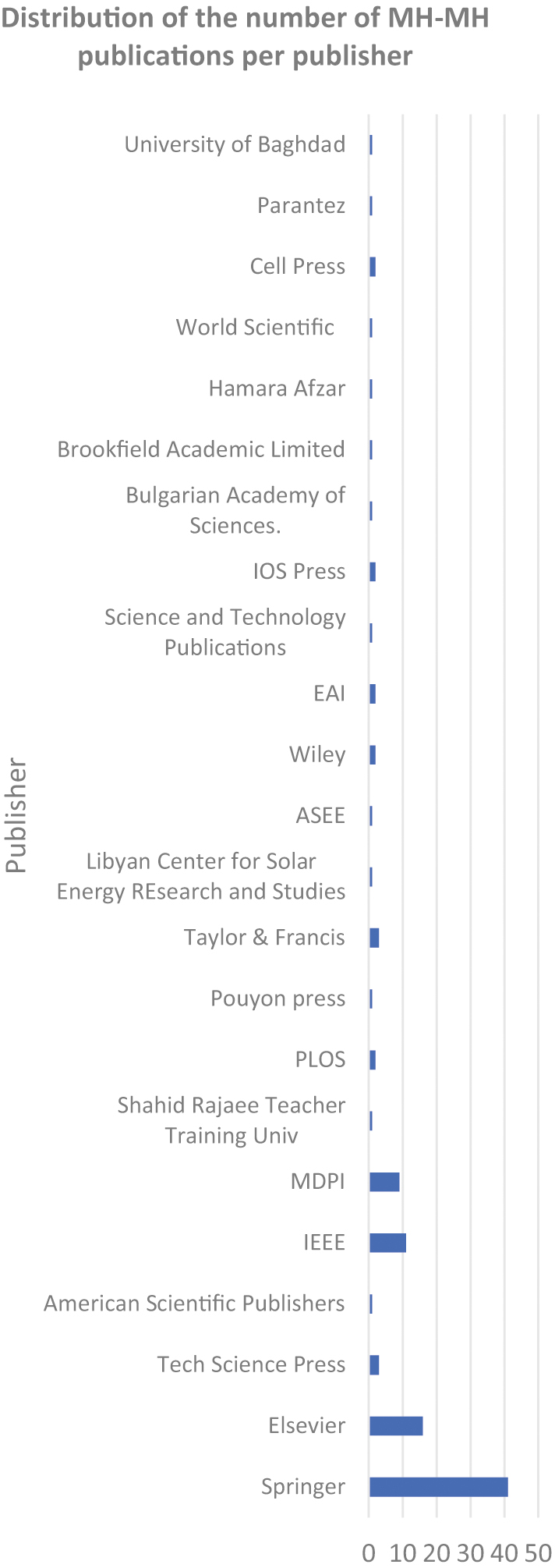 Fig. 12. Distribution of the number of MH-MH publications per publisher.