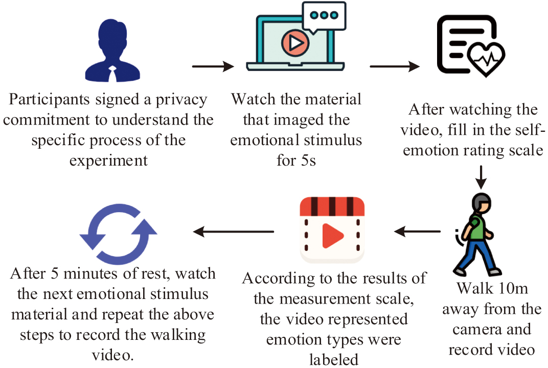 Existing emotion recognition methods based on electroencephalogram (EEG), voice, expression, etc., require the subjects to complete different test tasks or wear specific equipment, which has certain limitations in practical applications. In contrast, walking patterns are natural and unnoticeable physiological features that can be collected without affecting subjects’ normal activities. They can also accurately assess students’ psychological states in real time [15–17]. During the training data collection process, the study selects a total of 234 students from a Medical University as the data collection subjects. The experiment is formulated that the participants walk 10 m toward the camera each time and the video of the students’ walking is recorded. The video length contained at least one gait cycle.