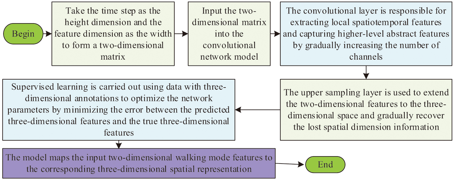 Fig.ure 3 shows the first step of the study, which involves converting the two-dimensional features into a structure similar to an image. The time step is taken as the height dimension, and the feature dimension is taken as the width, forming a two-dimensional matrix. The next step is for it to be input into the convolutional layer. The convolutional layer gradually increases the number of channels to extract local spatio-temporal features and capture higher-level abstract features. The upper sampling layer is used to extend the two-dimensional features to the three-dimensional space and gradually recover the lost spatial dimension information. Supervised learning is conducted during the training process using data with three-dimensional annotations. This optimizes the network parameters by minimizing the error between the predicted and true three-dimensional features. Ultimately, the network is capable of mapping the input two-dimensional walking mode features to the corresponding three-dimensional spatial representation. It can achieve the feature transformation from two-dimensional to three-dimensional.