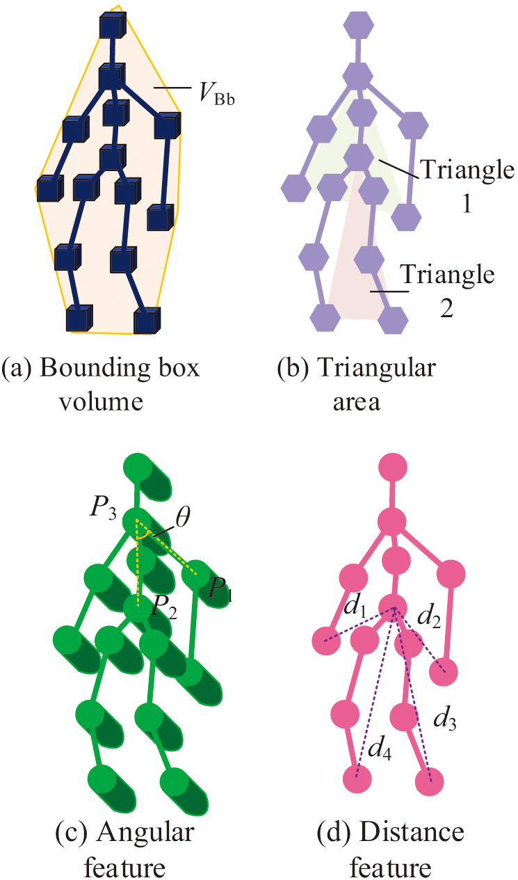 In Equation (6), , , and are the coordinates of the three skeleton points involved in the pinched angle. is the value of the pinched angle, the points and are the endpoints, and is the corner point. In addition to the pinch angle feature and the edge box volume feature, the study uses the distance between specific joints as an important indicator for recognizing emotions. The triangle area feature, on the other hand, characterizes subtle changes in walking patterns by calculating the area of triangles formed by specific skeletal points. Two triangle area features are chosen to characterize emotions. These are the triangle area between the neck of the hand (Triangle 1) and the triangle area between the foot and hip (Triangle 2). The study choose the velocity of the right and left hands, the right and left feet, and the head for a total of five joint points as spatio-temporal features. For the kinematic features, the study used variable acceleration as an indicator. The study takes the higher-order derivatives of the acceleration to obtain the variable acceleration. The specific characterization of triangle area, boundary frame volume, angle feature, and distance feature is shown in Fig. 5.