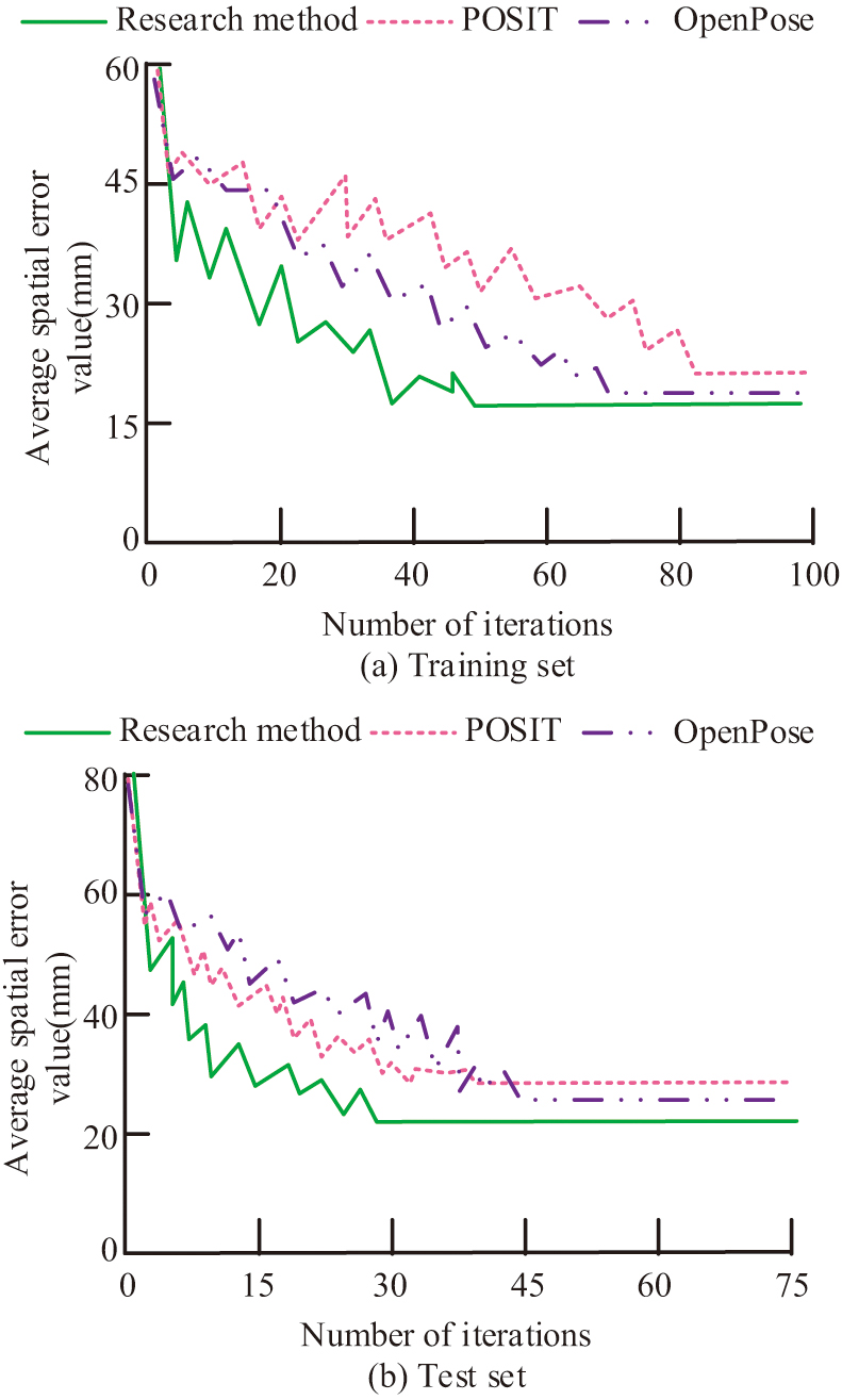 To improve the feature extraction accuracy of the walking pattern, the study obtains 2D information through 2D pose estimation and inputs it into a 3D network to realize feature extraction. To test the performance of the proposed feature extraction model, the study compares it with the classical pose from orthography and scaling with iterations (POSIT) algorithm and OpenPose algorithm. The average spatial error of each method for extracting the 3D coordinates of the keypoints is compared. The variation of the error values of the three methods under the training and test sets is shown in Fig. 8.