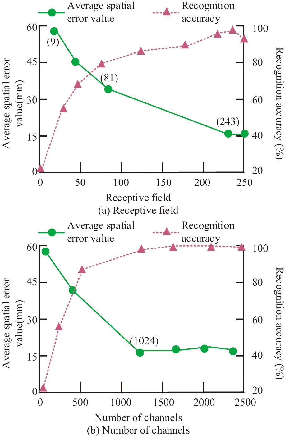 In Fig. 9(a), the recognition accuracy shows an increasing and then decreasing trend with the increase in the receptive field when the number of channels is 1024, and the average spatial error reaches a minimum of 29.8 mm when the receptive field is 343, which is the highest. It reaches the highest at a receptive field of 243, which is 92.6%. The average spatial error shows a gradual decreasing trend and reaches the minimum value of 29.8 mm when the receptive field is 343. In Fig. 9(b), with the increase in the number of channels, the recognition accuracy gradually rises with the increase in the number of sensing field of 243. When the number of channels exceeds 1024, the improvement of accuracy is no longer obvious, while the average spatial error gradually decreases. When the number of channels reaches 1024, the error value is already low. Continuing to increase the number of channels has a limited effect on the improvement of the error value. Therefore, the optimal sensing field is 243, and the number of channels in the convolutional layer is 1024.