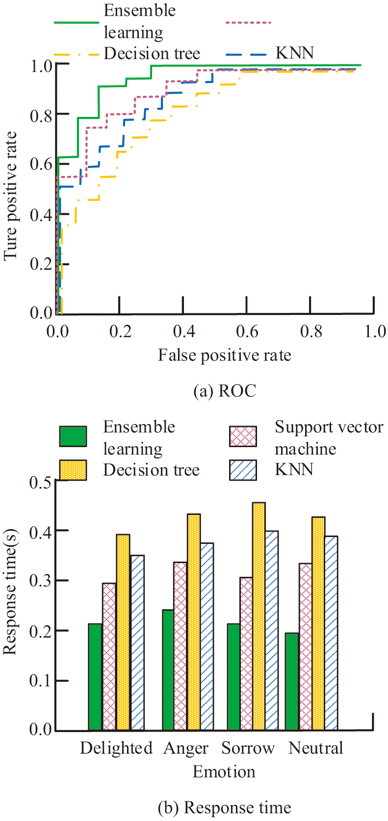 In Fig. 10(a), the AUC value of the integrated learning method is 0.95. The AUC values of KNN, decision tree algorithm, and support vector machine are 0.89, 0.90, and 0.87, respectively, which are all smaller than that of the integrated learning method. In Fig. 10(b), the response time of the integrated learning method is only slightly higher than that of the weak classifier in the four emotional state data, and the average value is only 0.25 s. It proves that the integrated learning method has good real-time performance while maintaining high recognition accuracy.