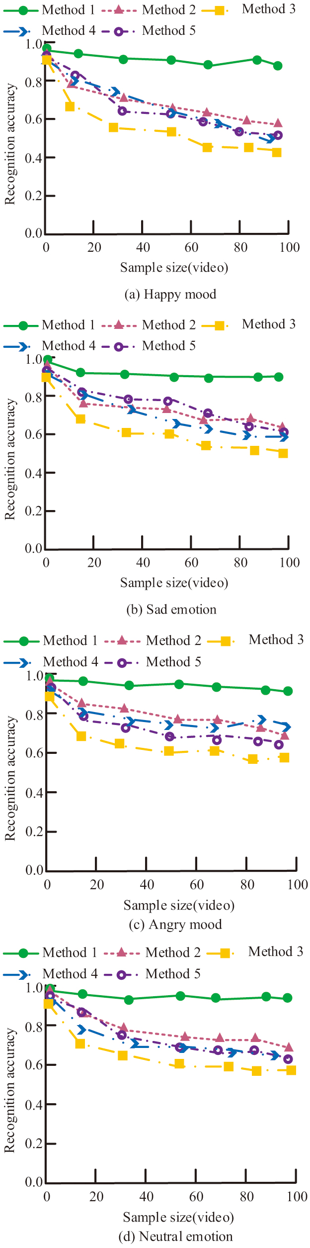 In Fig. 11, the recognition accuracy of all four emotions decreases with the increase in the number of samples, and the decrease of Method 1 is the smallest. In Fig. 11(a), the average recognition accuracy of Method 1 reaches 90.25% for the happy mood, while the average accuracy of the other four methods is lower than 90%. In Fig. 10(b), the recognition accuracy curves of Method 1 are higher than the other methods. In Fig. 10(c), the average recognition accuracy of Method 1 reaches 91.03% under the anger mood. In Fig. 11(d), the recognition accuracy of Method 1 remains higher than the other methods.