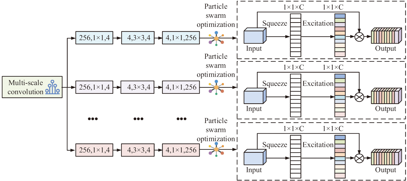 In equation (3), and denote the updated speed and position, respectively. denotes the inertia weights. and denote learning factors. and denote random constants which range between [0, 1]. denotes the OP found by the particle. denotes the global OP found by all the particles. denotes the position of the particle at the moment. To improve the Acc of FE, the study uses the squeeze-and-excitation (SE) module to adaptively calibrate the feature channel responses. This module models the interdependence between channels in a convolutional neural network through global average pooling (GAP) and fully connected layers (FCLs) to enhance the representation and generalization of the network while maintaining computational efficiency [22]. The computation of the SE module is shown in equation (4):