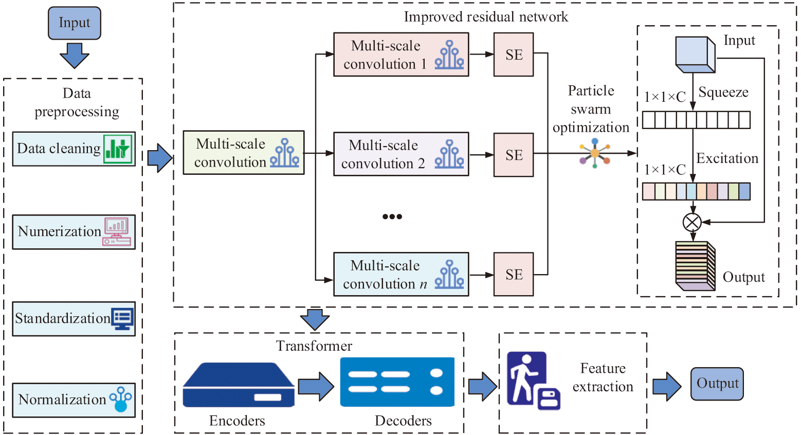 Figure 1 shows the MSC process on the left. The study uses the PSO algorithm to optimize network parameters after each convolution module. Then, the channel weights of the features are adaptively adjusted by the SE module to improve the representation ability of the network. To optimize the improved ResNet, the study uses the multilayer structure of the Transformer model to transform the input data into embedding vectors. Position information is added to the embedding vectors using positional coding to preserve the sequence order, and the stability of the model is enhanced using residual join and layer normalization [23]. The calculation of its layer normalization is shown in equation (5):