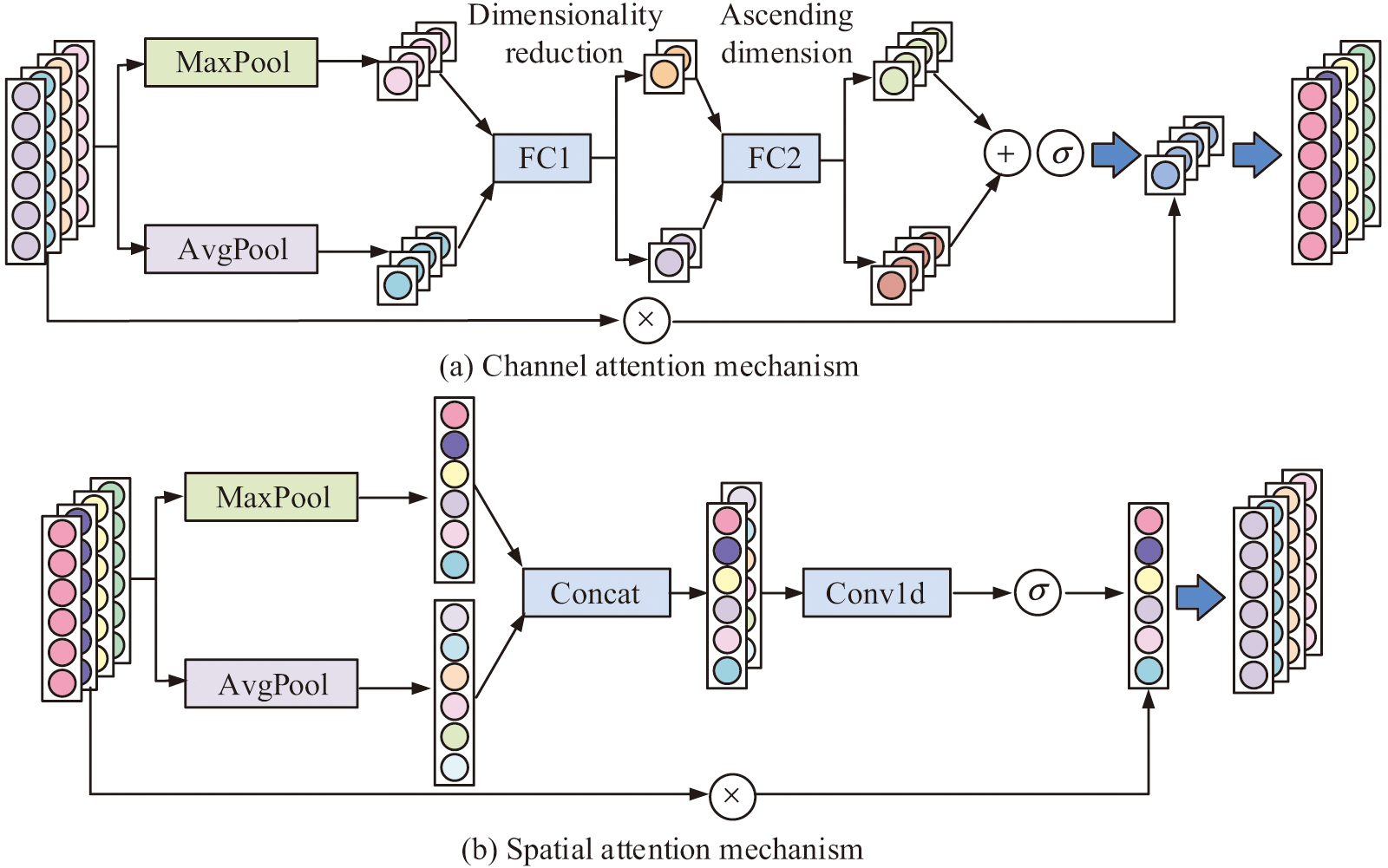 In equation (8), denotes the features obtained by splicing operation. and denote the maximum and average values of the input features, respectively. denotes the feature after convolution operation. denotes one-dimensional convolution operation. denotes spatial attention weight. denotes the original input features. The structural organization of the channel attention (CA) and spatial AM is illustrated schematically in Fig. 4.
