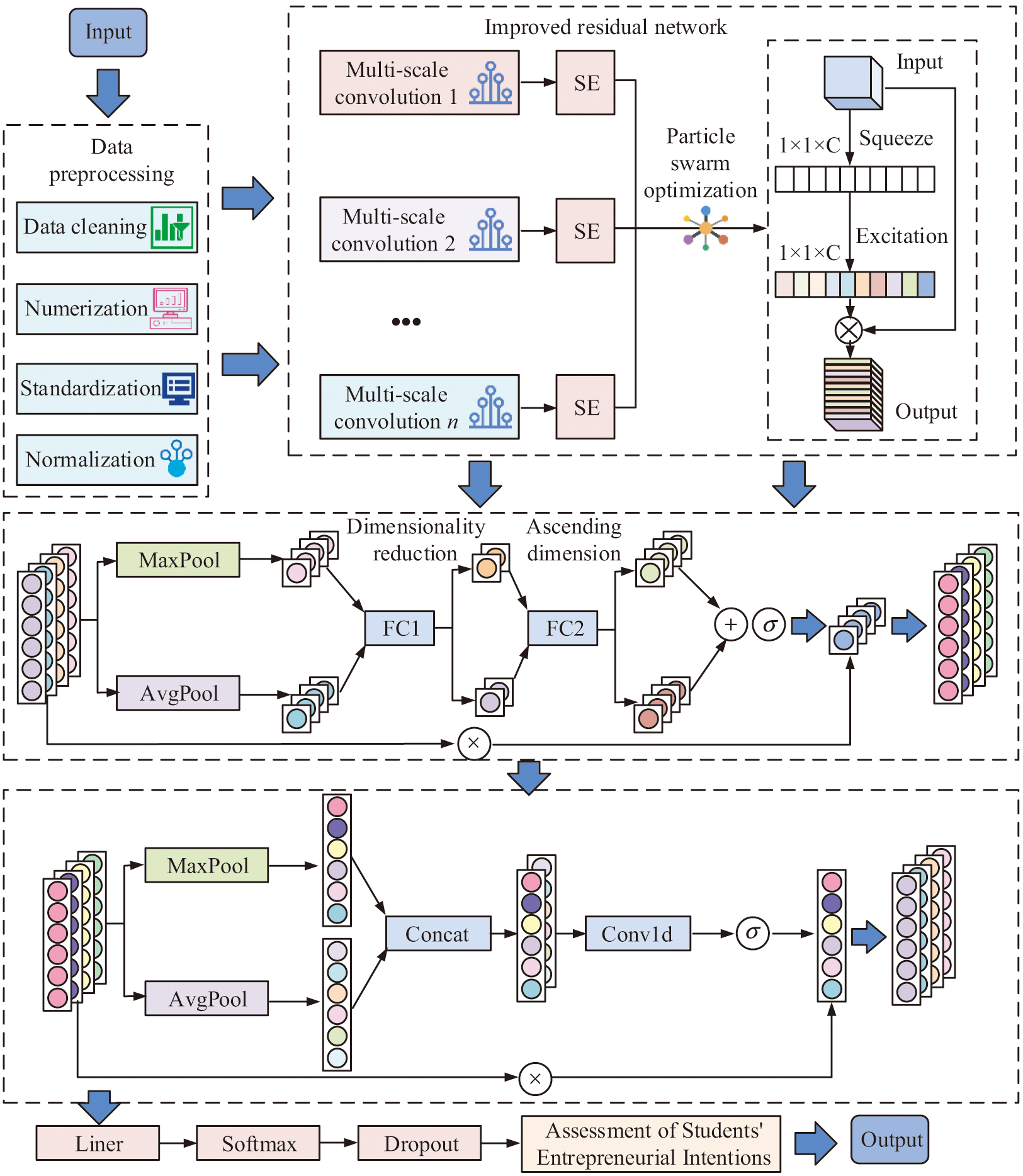 With the rapid development of the global economy and the increasingly fierce competition in the market, entrepreneurship has become an important force to promote social and economic progress. In recent years, entrepreneurship education (EE) has been widely emphasized and promoted in colleges and universities, and it has an important influence on college students’ social entrepreneurial intentions [1]. EE helps students to master the information and willingness of entrepreneurship through a systematic curriculum. It focuses on the shaping of students’ psychological characteristics and helps students establish a positive entrepreneurial mindset through entrepreneurship lectures and practical activities [2]. However, how to accurately assess students’ entrepreneurial intentions in order to provide scientific basis and personalized guidance for EE is the current challenge [3]. However, traditional methods of entrepreneurial intention assessment mostly rely on questionnaires and statistical analysis. The method has problems such as strong subjectivity, single data dimension, and difficulty in capturing complex relationships, which makes the accuracy (Acc) of students’ entrepreneurial intention assessment lower [4]. Therefore, exploring an efficient and highly accurate method for assessing students’ entrepreneurial intention has become the key to current research [5]. The quick advancement of artificial intelligence technology in recent years has given rise to fresh concepts and instruments for evaluating entrepreneurial purpose [6]. As advanced deep learning technologies, residual networks (ResNet) and attention mechanism (AM) have produced impressive outcomes [7].