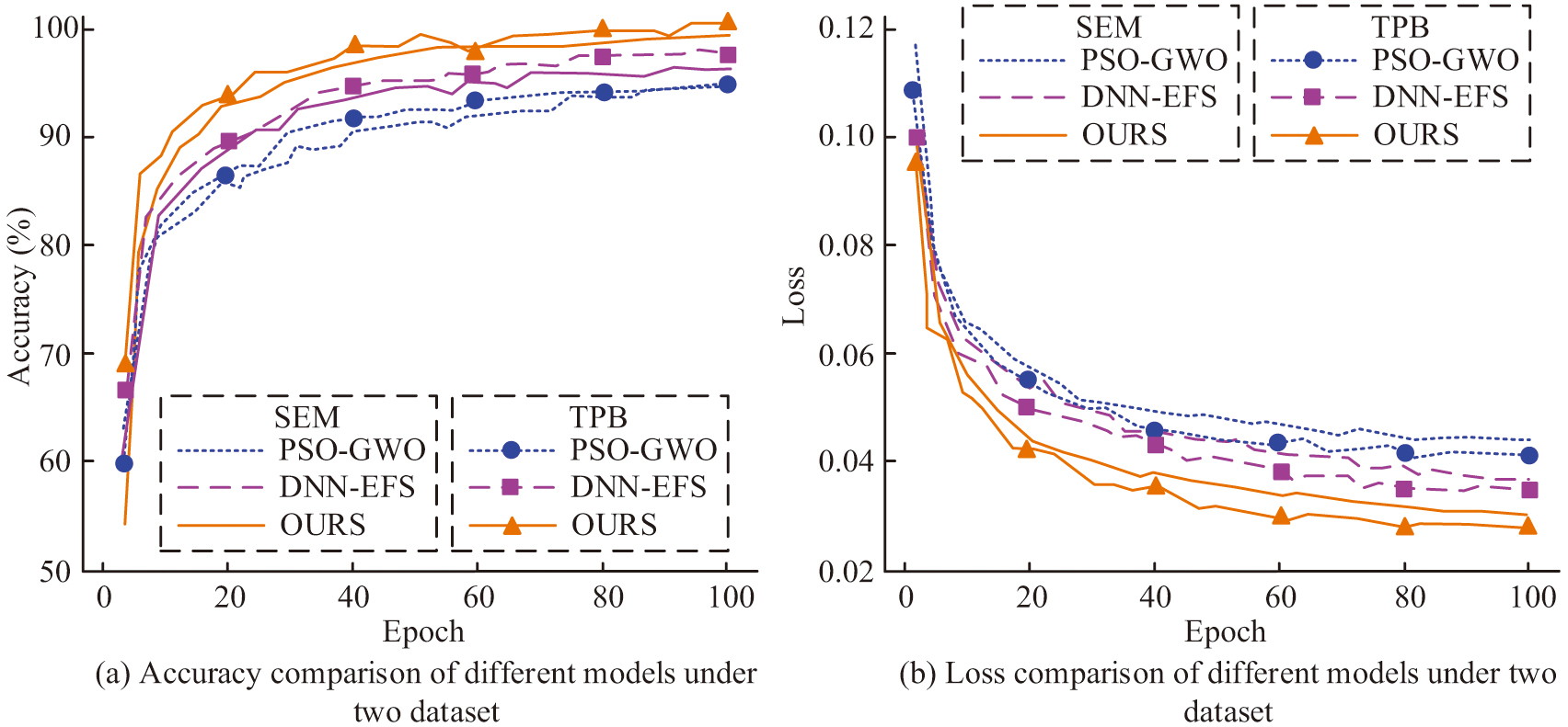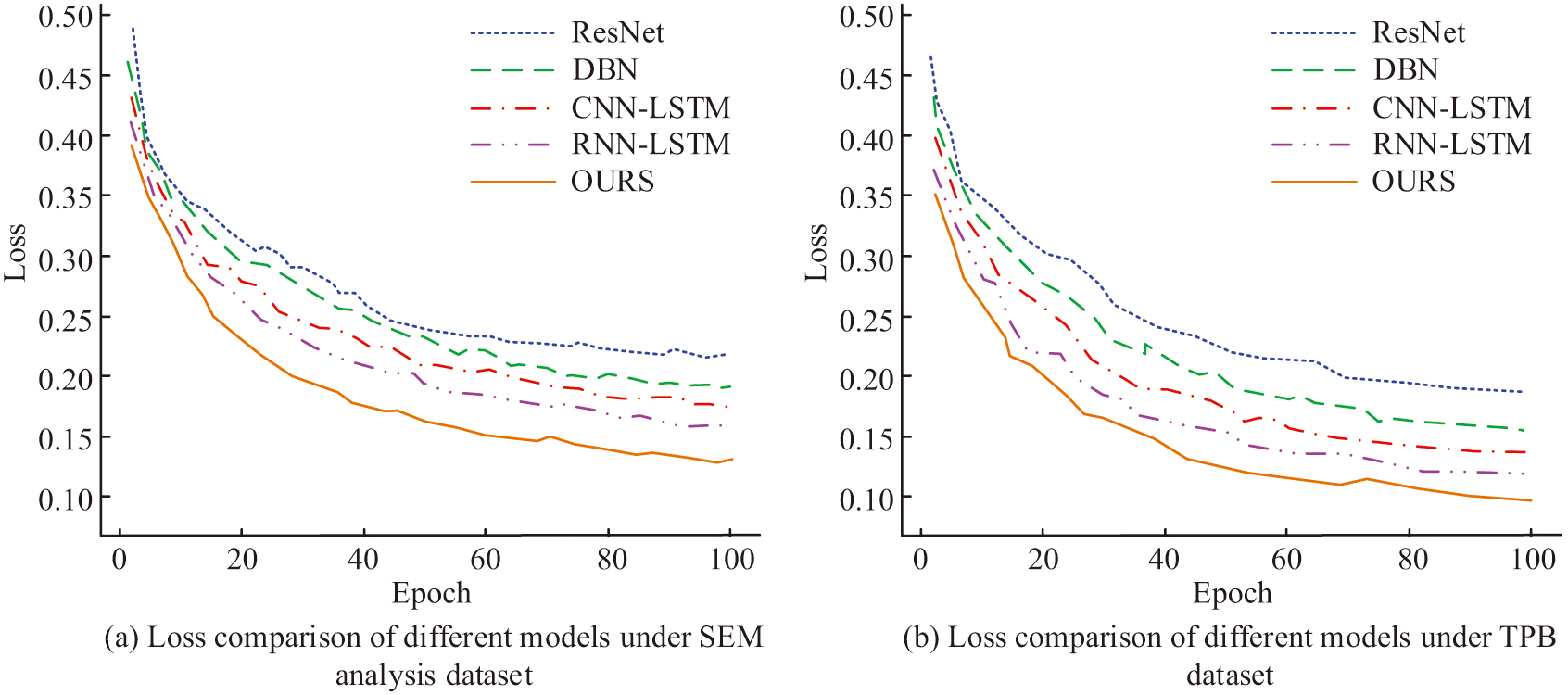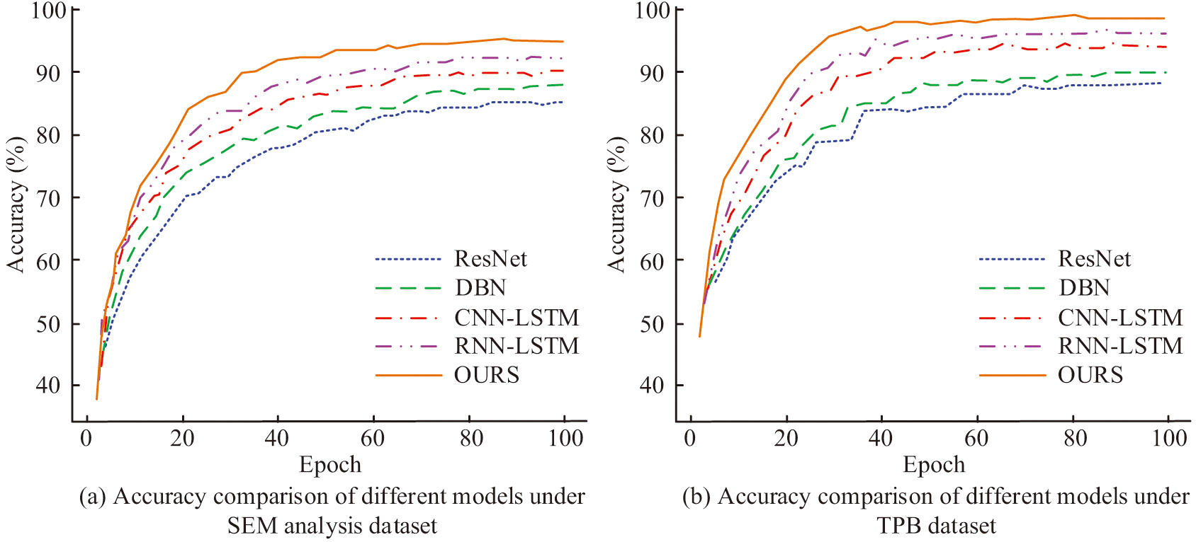 Initially, the experiments are analyzed in the SEM analysis dataset and TPB dataset to assess the Acc of the proposed method and to compare it with existing models. Comparison models include improved ResNet, deep belief network (DBN), convolutional neural network and LSTM (CNN-LSTM), and recurrent neural network and LSTM (RNN-LSTM). When there are 20 training rounds in the SEM dataset, as shown in Fig. 6(a), the Acc of the ResNet and DBN models is 69.89% and 73.64%, respectively. The Acc of CNN-LSTM, RNN-LSTM, and the proposed model are 78.12%, 80.05, and 84.77%, respectively. When the training rounds reach 80, the Acc of the five models is 82.82%, 85.68%, 88.96%, 90.08%, and 93.69%, respectively. In Fig. 6(b), the Acc of ResNet, DBN, CNN-LSTM, and RNN-LSTM models in the TPB dataset with 80 training rounds is 83.66%, 86.96%, 92.15%, and 94.13%, respectively. The suggested model’s Acc is 97.62%, which is greater than the Acc of the other four models by 13.96%, 10.66%, 5.47%, and 3.49%, respectively. The outcomes demonstrate that the suggested approach is feasible.