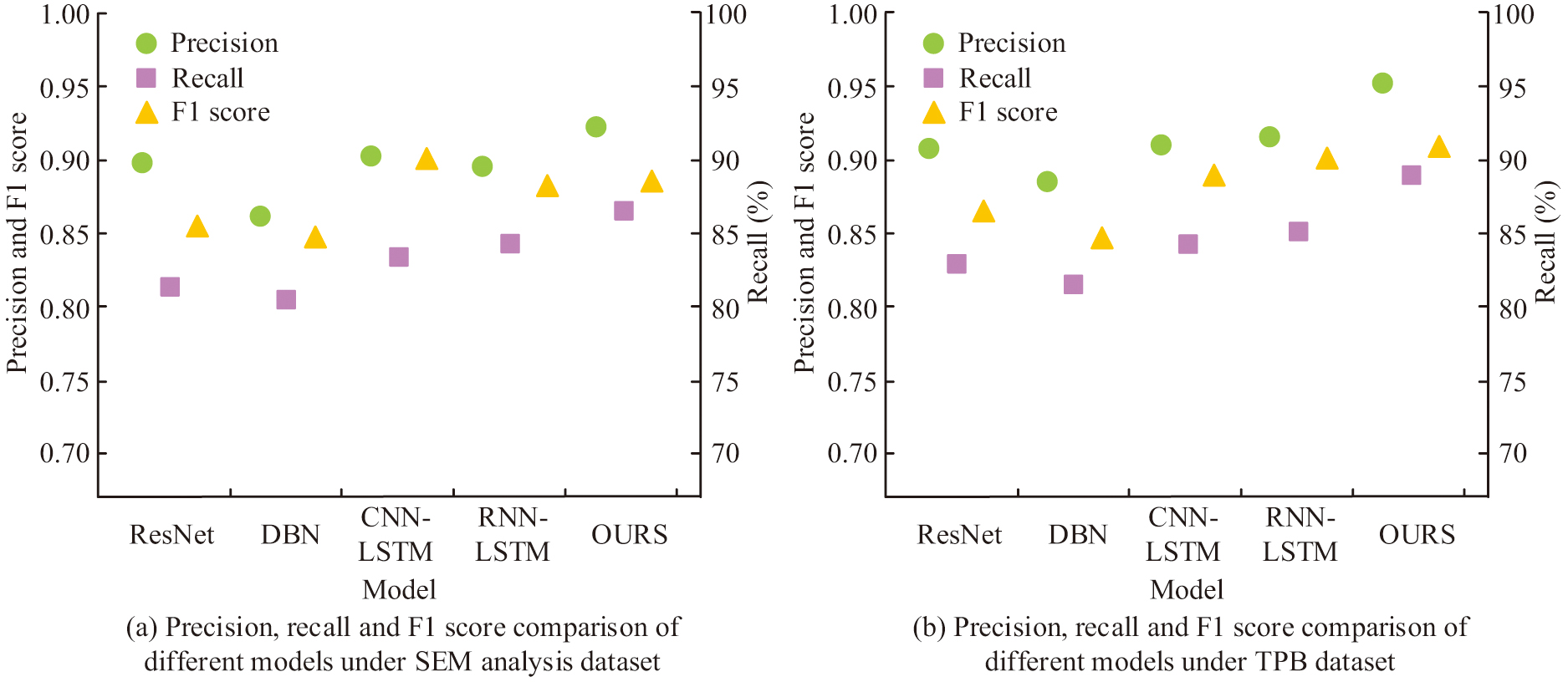 The experiments are further conducted to compare and analyze the precision, recall, and F1 of different models under the two datasets as a way to verify the reliability of the proposed method. Figure 8 presents the findings. In Fig. 8(a), the precision of ResNet, DBN, CNN-LSTM, and RNN-LSTM models in the SEM dataset are 0.892, 0.858, 0.908, and 0.887, respectively. The recall rates are 81.85%, 80.03%, 84.12%, and 84.66%, respectively. The F1 score is 0.858, 0.841, 0.902, and 0.867, respectively. Compared with it, the proposed model has a precision of 0.928, which is an improvement of 3.88%, 7.54%, 2.165%, and 4.42%. Its recall and F1 score are 86.27% and 0.889, respectively. In Fig. 8(b), the precision of the five models in the TPB dataset is 0.908, 0.882, 0.901, 0.915, and 0.956, respectively. The recall rates are 83.39%, 81.47%, 84.92%, 85.09%, and 89.13%, respectively. The F1 scores are 0.864, 0.841, 0.892, 0.905, and 0.912, respectively. The findings demonstrate that the suggested model outperforms the other examined models in terms of precision, recall, and F1 scores.