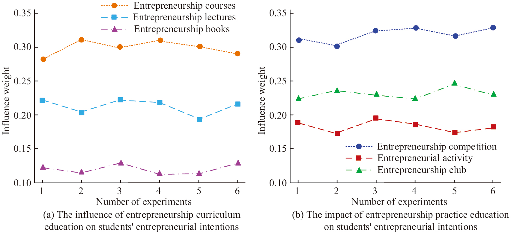 The experiment further explores the influence of EE on students’ entrepreneurial intention by taking the EE program of a university as an example. Its influence weight is also evaluated, aiming to accurately assess students’ entrepreneurial intention through deep learning techniques. EE mainly includes entrepreneurship course education and practical education. Entrepreneurship curriculum education covers entrepreneurship courses, entrepreneurship lectures, and entrepreneurship books. Entrepreneurship practice education includes entrepreneurship competitions, entrepreneurship activities, and entrepreneurship clubs. In Fig. 11(a), in entrepreneurship curriculum education, entrepreneurship courses and entrepreneurship lectures have impact weights of 0.31 and 0.22, respectively. Entrepreneurship books have a lower impact weight of 0.12. In Fig. 11(b), in entrepreneurship practice education, entrepreneurship competition has a greater impact on students’ entrepreneurial intention, with an impact weight of 0.32. The impact weights of entrepreneurship activities and entrepreneurship clubs are 0.23 and 0.18, respectively. The results show that education in both entrepreneurship courses and entrepreneurial practice play a significant role in students’ entrepreneurial intentions. They are more effective in enhancing students’ entrepreneurial intentions.