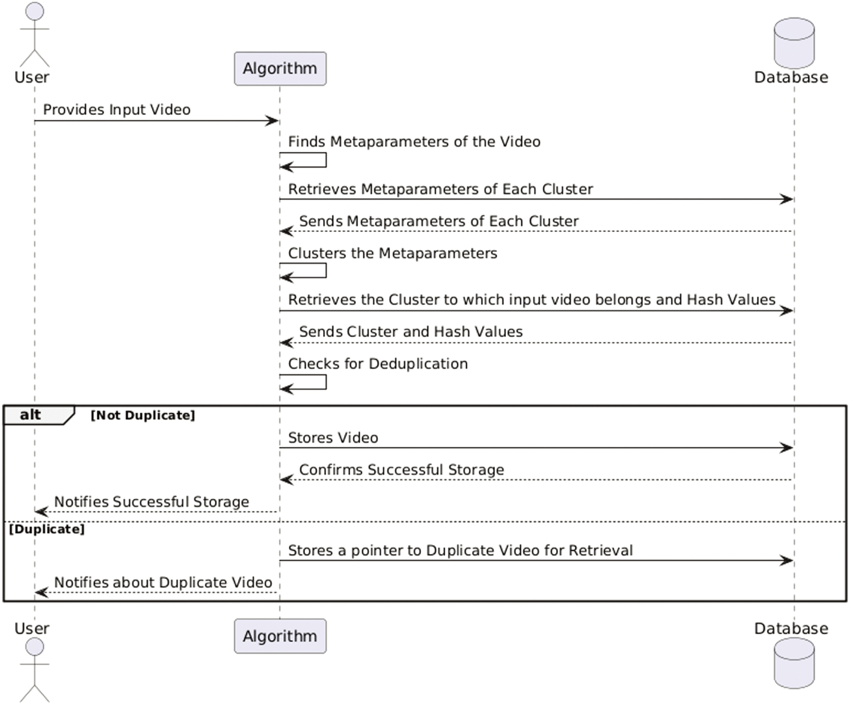 This sequence diagram in Figure 2 depicts how a video deduplication and storage algorithm interact with the user, algorithm, and database. The procedure begins with the user uploading a movie, after which the system extracts its meta-parameters, which include resolution, frame rate, duration, and keyframe signatures. These meta-parameters are then compared to those of video clusters already in the database. The system retrieves the cluster to which the input video may belong and its accompanying hash values. The system detects whether the input video is unique or duplicate by comparing its extracted meta-parameters to the recovered cluster data.