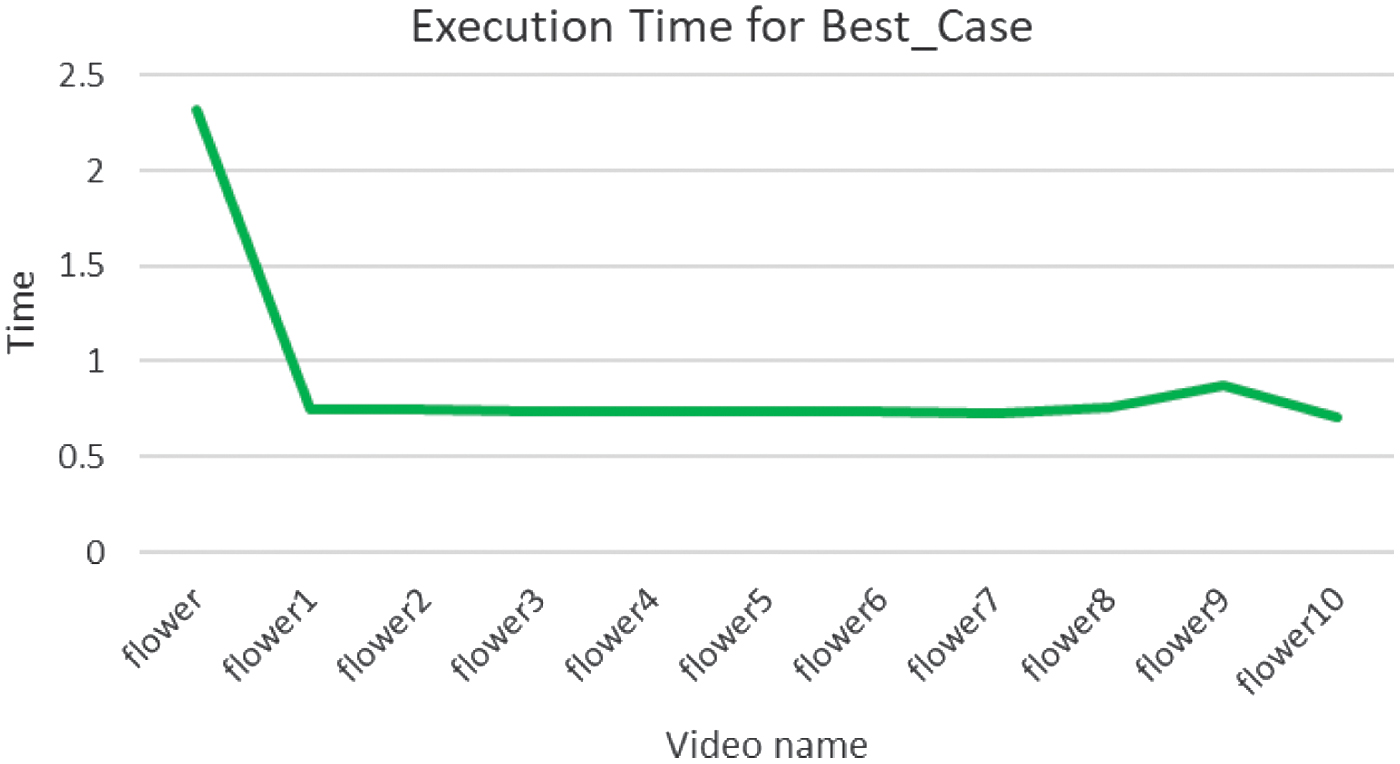 The execution time for the average case in Figure 6 scenario depicts a realistic measurement of the deduplication system’s performance under conditions that are ordinary. Here, some of the input query videos are redundant copies, while the rest are unique. This represents a common use case. It shows the system’s efficiency in handling a moderate amount of duplicate video content, concluding that the system maintains a balanced performance by processing duplicates efficiently without notable delays. The initial videos are found to take a considerable execution time, but this improves for the subsequent videos, by only requiring a minimal execution time which is almost constant.