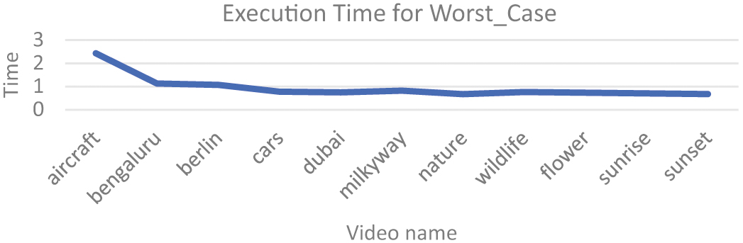 The execution timings for several videos under three distinct conditions are displayed in Figure 9 named “Comparison of Execution Time for Best Case, Average Case, and Worst Case.” While other videos have lower, but varying, execution times, the Worst Case (in purple) has much greater times for the “aircraft” and “Beijing” films, with times as high as 2.5 seconds. The “Beijing” video’s Average Case (highlighted in red) has the longest execution duration, peaking at 2.5 seconds. The other movies have intermediate execution times. With very little differences, the Best Case (shown in blue) exhibits short execution times in every video. With the Best-Case scenario showing the fastest processing times across all movies, this graph illustrates the performance variations between the scenarios. In Fig. 11, the deduplication efficacy is compared for the Best-Case, Average-Case, and Worst-Case situations.