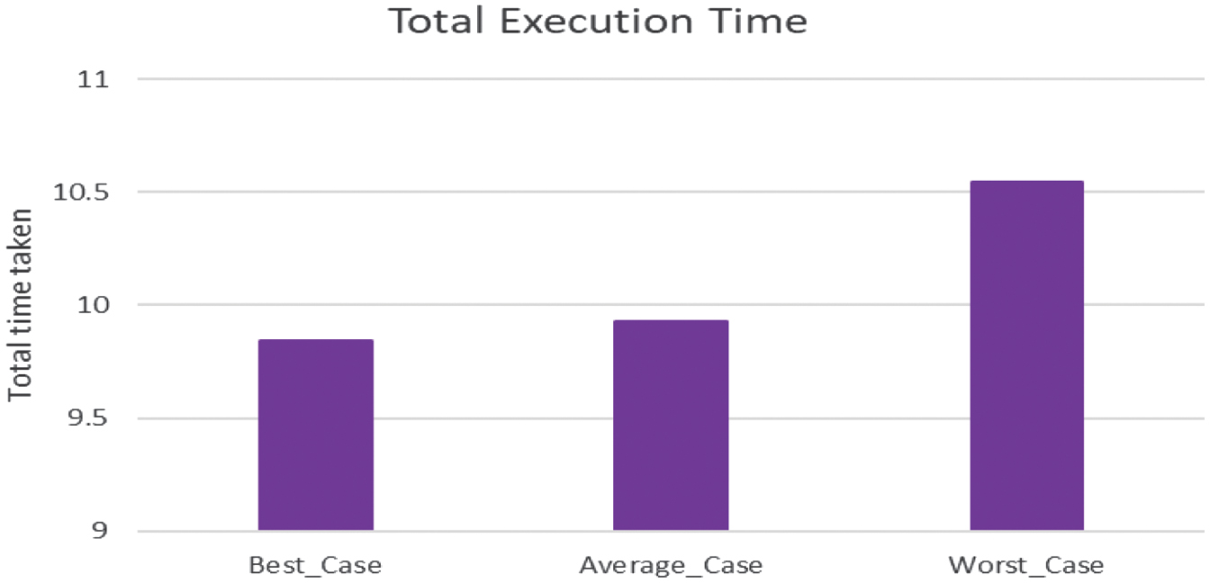Three distinct scenarios are compared in Figure 8 “Total Execution Time”: Best Case, Average Case, and Worst Case. With an execution time of just over 9.5 seconds, the Best-Case scenario has the shortest time. It takes longer, about 10 seconds, in the Average-Case scenario. With an execution time of almost 10.5 seconds, the Worst-Case scenario has the longest. The system operates most effectively in the Best-Case scenario, according to this comparison, with performance gradually declining in the Average- and Worst-Case situations.