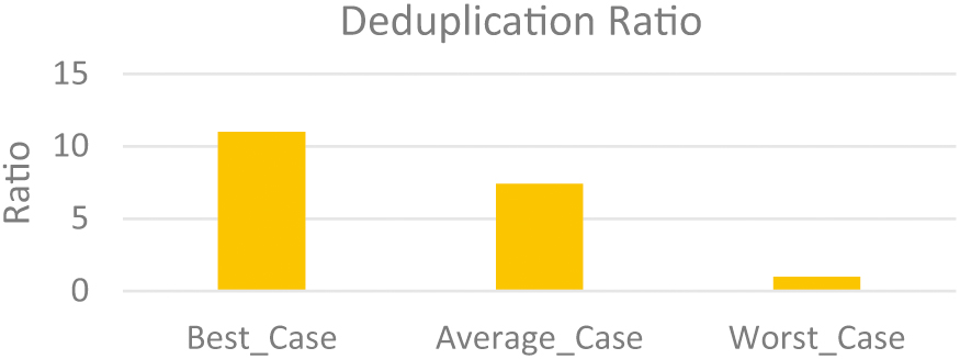 With a deduplication ratio of 11:1, the Best-Case scenario has the greatest, suggesting a notable decrease in redundant data. A lower deduplication ratio, of 7:1, is seen in the Average-Case scenario, indicating moderate efficacy. The deduplication ratio in the worst-case scenario is the lowest – it is 1:1, suggesting very little deduplication. With the Best Case getting the largest data reduction, the Average Case coming in second, and the Worst Case doing the least well, this comparison demonstrates the uneven effectiveness of the deduplication process.
