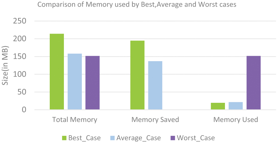 The memory utilization in the best, average, and worst-case scenarios is contrasted in Figure 12. Memory Used, Memory Saved, and Total Memory are displayed on the x-axis. Size is shown on the y-axis in megabytes. The best case utilizes the most Total Memory (215 MB), followed by the worst case (150 MB) and average case (160 MB). Memory Saved shows that the worst scenario has no data shown, the average case saves roughly 140 MB, and the best case wins again with 195 MB. Remarkably, the pattern is reversed when it comes to Memory Used: the worst scenario requires 150 MB of memory, while the best and medium cases use much less (approximately 20–25 MB each). This implies that even though the optimal situation has the largest memory allocation overall, it saves memory more effectively, resulting in the lowest memory consumption.