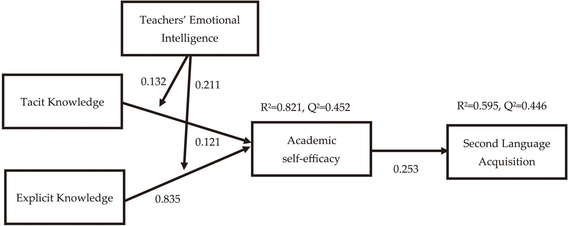 This study contributes significantly to the understanding of how EI, tacit and explicit knowledge-sharing behaviors, and academic self-efficacy interact to influence SLA in AI-supported environments. Drawing upon the broaden-and-build theory and social cognitive theory, we proposed and empirically tested a model that demonstrates the centrality of EI as a mediating factor in the relationship between knowledge sharing and academic self-efficacy. The findings affirm that both tacit and explicit knowledge-sharing behaviors positively impact teachers’ academic self-efficacy, with emotionally intelligent educators being more effective in leveraging these knowledge forms to support their professional roles. Furthermore, academic self-efficacy emerged as a critical enabler of effective second language instruction, highlighting the importance of teacher confidence in achieving successful learning outcomes. The integration of AI technologies has added a transformative dimension to the second language teaching process. Artificial intelligence (AI) tools such as adaptive learning systems, intelligent tutoring platforms, and emotion-aware applications can facilitate the transfer of both explicit and tacit knowledge. These technologies provide teachers with real-time feedback, personalized instructional recommendations, and tools for emotional tracking, all of which contribute to the development of a more responsive and engaging teaching environment. Our results show that emotionally intelligent teachers with high self-efficacy are more willing and capable of integrating these AI tools into their pedagogy, leading to more sustainable and effective language learning experiences for students.