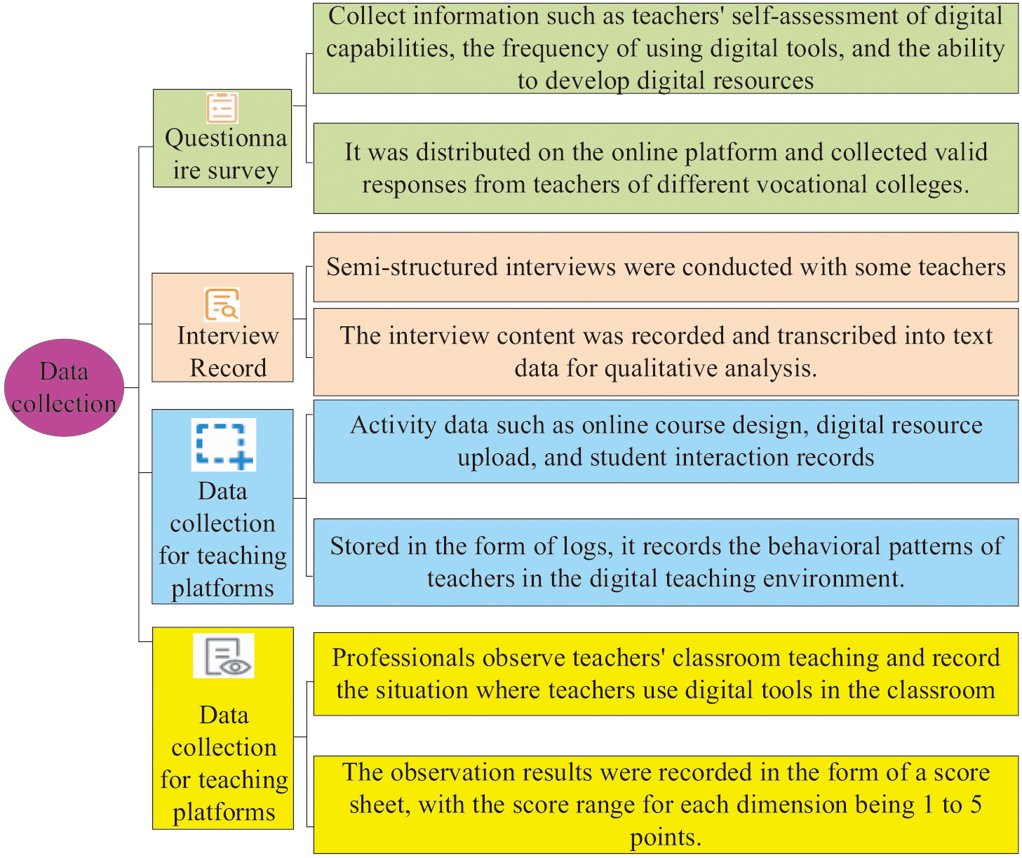 In Fig. 2, the data collection methods mainly include questionnaire surveys, interview records, data collection from teaching platforms, and classroom observations. Questionnaire surveys are mainly used to collect information on teachers’ self-assessment of digital abilities, frequency of use of digital tools, and digital resource development capabilities. They are mainly distributed through online platforms [13,14]. The interview records are mainly in a semi-structured form to gain a deeper understanding of the specific practical experience and challenges encountered by teachers in digital teaching. Data capture mainly includes online course design, student interaction records, etc., usually stored in the form of logs. Finally, professional personnel are arranged to observe classroom teaching and record the use of digital tools by teachers in the classroom. The results are recorded in the form of a scoring table [15,16].