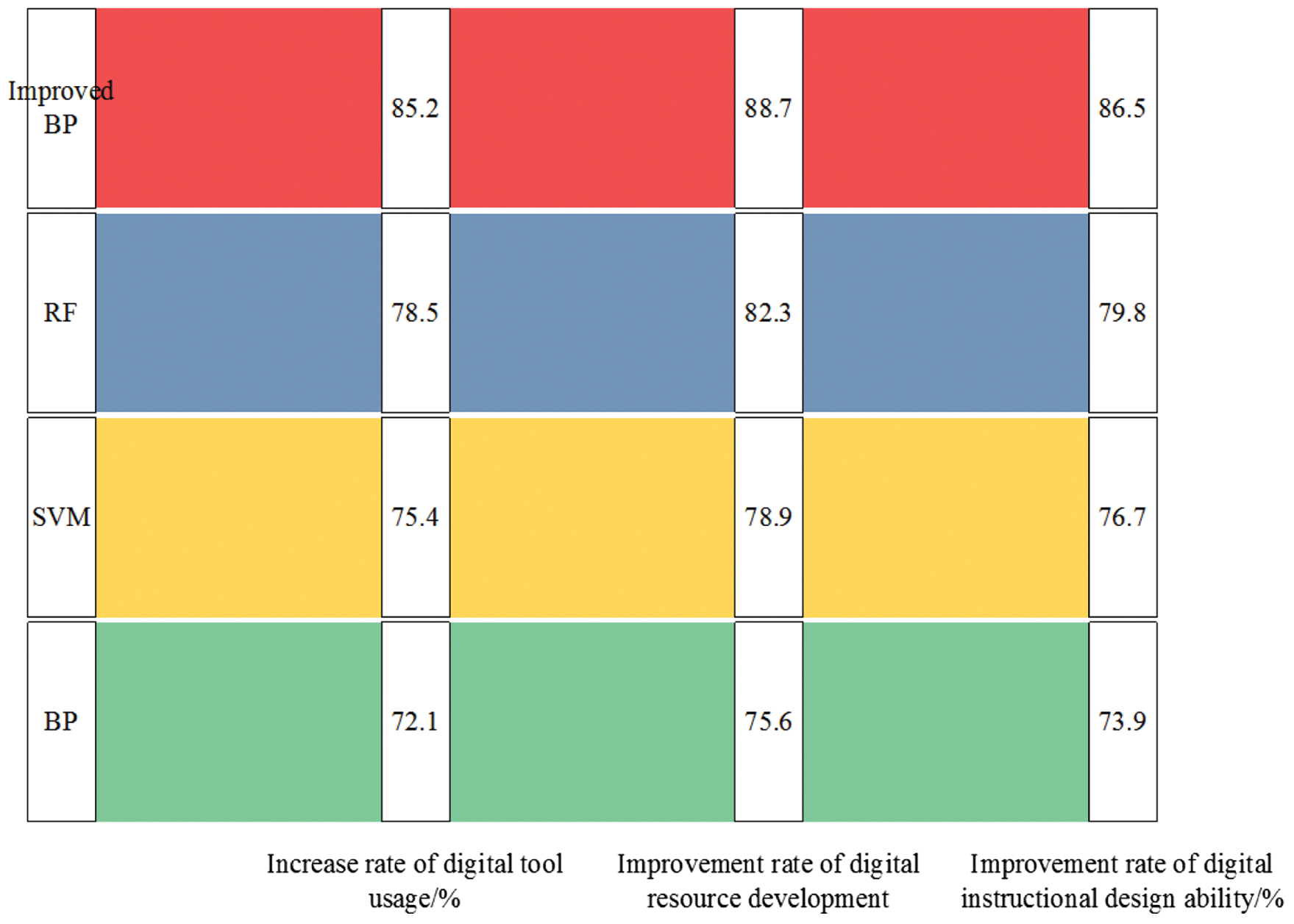 As displayed in Fig. 8(a), the improved BP has the peak accuracy after convergence, with a value approaching 0.959. Based on this, the study can conduct a detailed analysis of each teacher’s digital capabilities, identifying their specific needs in the use of digital tools, the development of digital resources, and the design of digital teaching. Targeted training courses and practical guidance can be provided for teachers who perform poorly in the use of digital tools. The second highest accuracy is RF and SVM, with their accuracy converging to 0.832 and 0.703. The worst accuracy after convergence is traditional BP, whose accuracy tends to 0.656 after convergence. In the recall curve of Fig. 8(b), the recall rate of the improved BP is also higher than that of the other models after convergence, and its value tends to 0.931. Research can be based on this to optimize the allocation of educational resources. For teachers who already have a relatively high level of digital skills, more advanced training courses are provided, while for those with weaker digital skills, basic training and one-on-one tutoring are offered. The second highest recall rates are SVM and traditional BP, with values tending toward 0.794 and 0.772. The worst recall rate is RF, with a value tending toward 0.698. This study compares the improvement effects of four models on teachers’ digital abilities, as shown in Fig. 9.