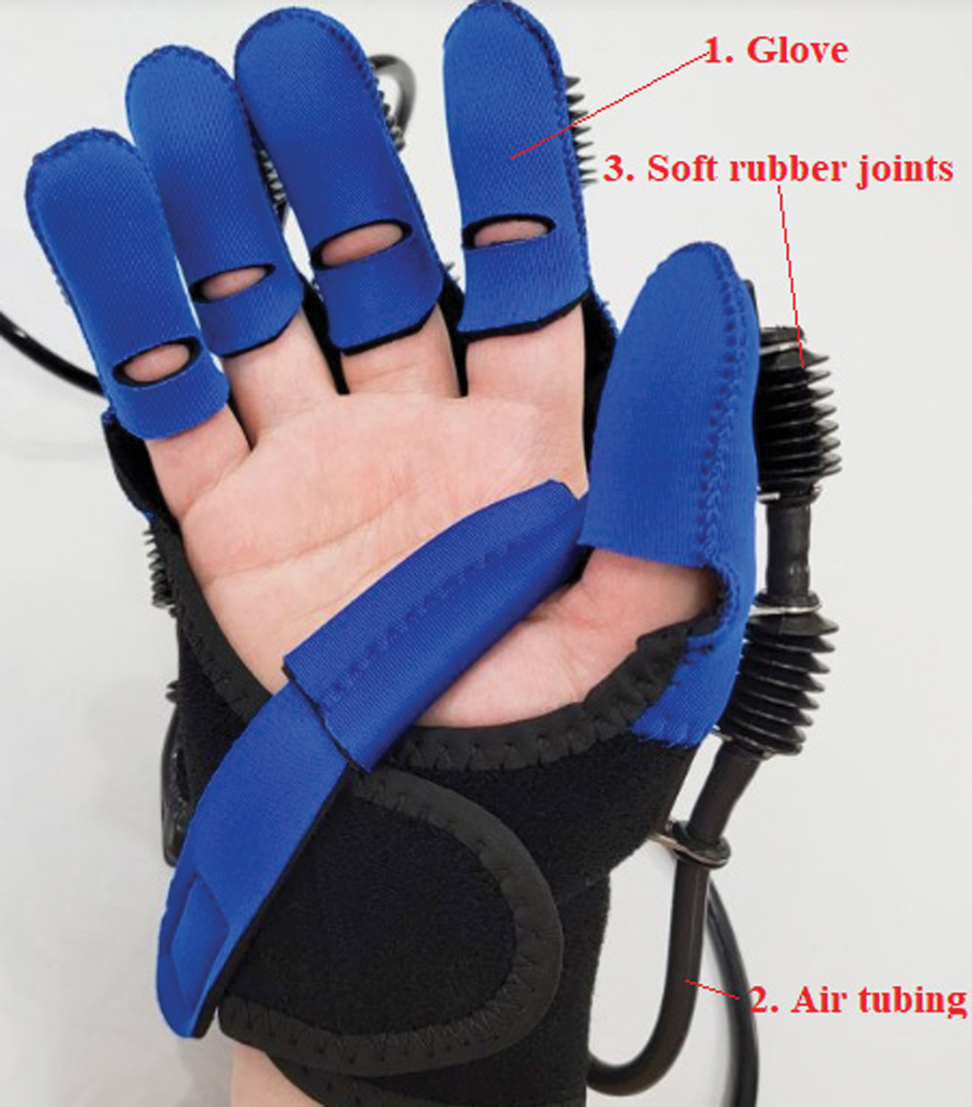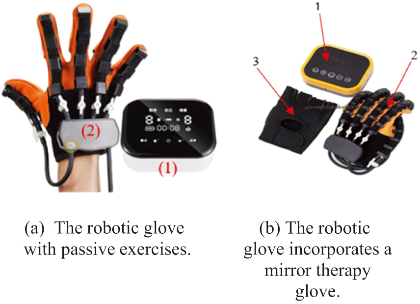 Various types of robotic rehabilitation gloves are currently available on the market, as shown in Fig. 1a and 1b. Fig. 1a depicts a glove with a relatively simple structure that operates on a preset timing mechanism. Its main components include: