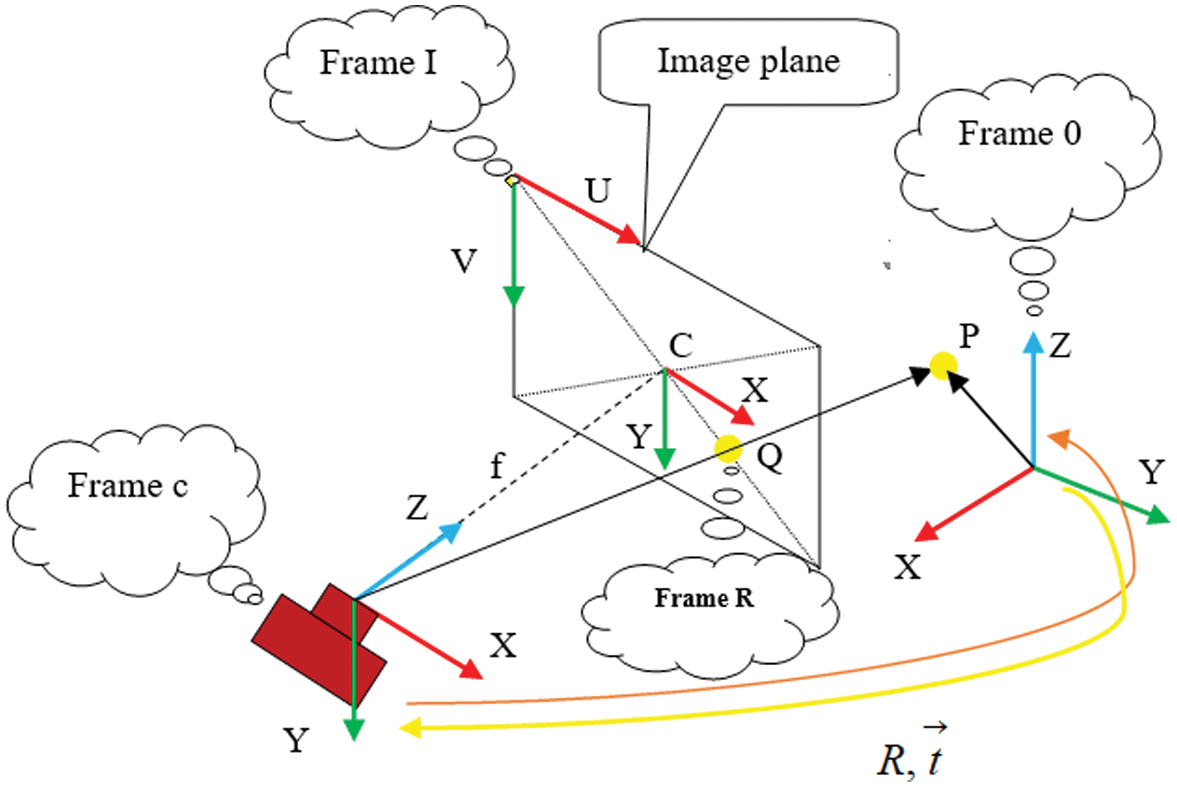 Consider a point P, represented in the C frame as . This vector intersects an image plane at a distance f (focal length) along the Z-axis of the C frame, with the intersection point denoted as Q. The process of determining the image coordinates in the I frame is known as projective transformation, as illustrated in Fig. 6.