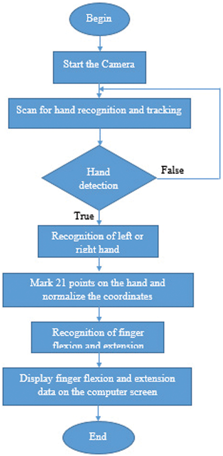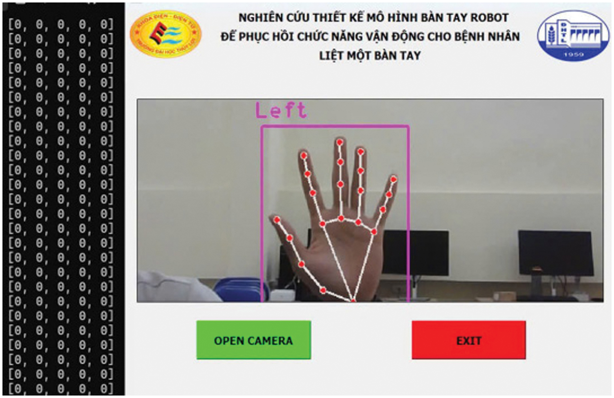 When the start button is pressed, the program initializes the camera. It then proceeds to scan and recognize the hand. If a hand is detected within the frame, the system identifies whether it is a left or right hand. Following this, 21 key points on the hand are marked, and their coordinates are normalized. The coordinate data of these 21 points is then used to determine the flexion/extension of the fingers, which is displayed on the screen. Simultaneously, the flexion/extension data of the fingers is transmitted via the USB port to the microcontroller using the Universal Asynchronous Receiver/Transmitter (UART) communication protocol, as illustrated in Fig. 9.