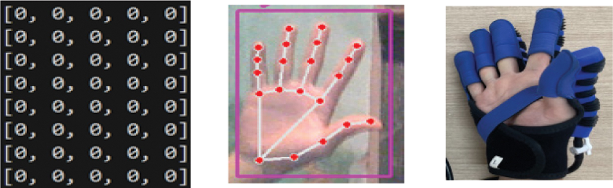 The results of finger flexion/extension recognition are presented in Fig. 11 to Fig. 14. As shown in Fig. 11, when all the intact fingers of the patient are fully extended, the MediaPipe technology identifies the key points on the intact fingers. This recognition generates a one-dimensional array of [0,0,0,0,0], which is then transmitted from the computer to the central microcontroller circuit via the UART communication protocol. Consequently, all the paralyzed fingers of the patient will also extend. This one-dimensional array is a variable, where the first element from left to right corresponds to the thumb, followed by the index finger, middle finger, ring finger, and little finger.