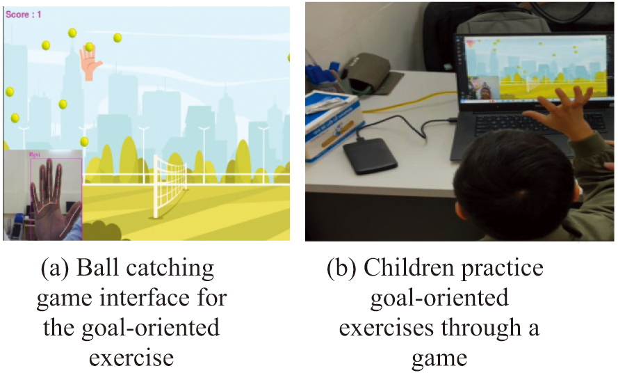 Fig. 16. Mirror therapy exercise and goal-oriented exercise. a) Ball-catching game interface for the goal-oriented exercise. b) Children practice goal-oriented exercises through a game.