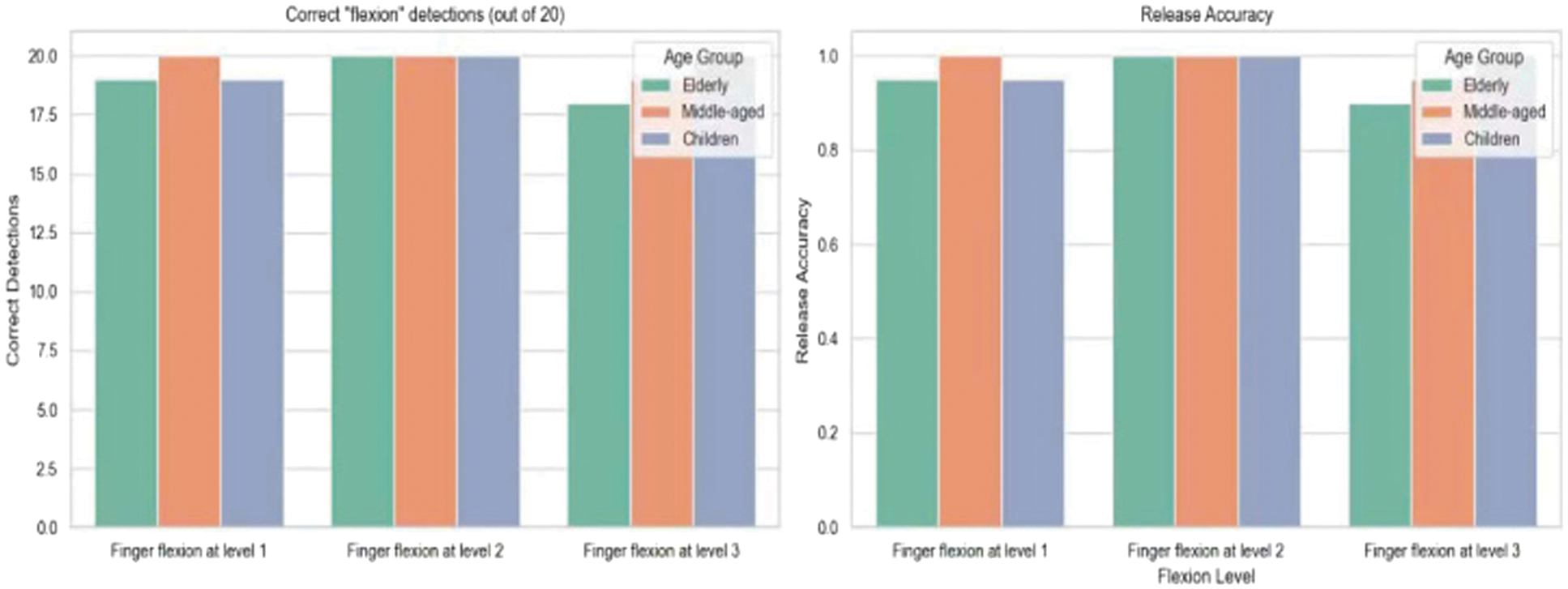 | Age group | Level | Correct “flexion” detections (out of 20) | Release accuracy | Correct “extension” detections (out of 20) | Release accuracy |