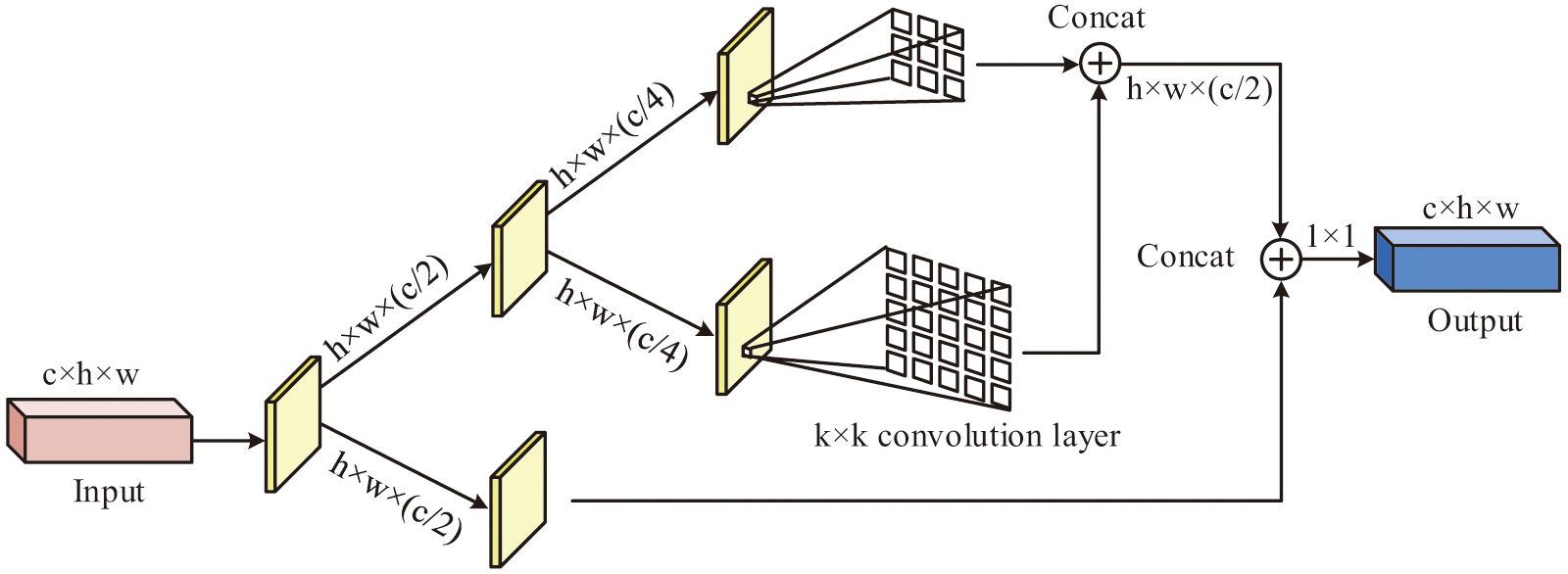 In Fig. 2, by processing FMs of various scales in parallel, the EMC module improves FE performance while lowering the amount of computation and parameters. The input FM of size is first passed through two parallel 1 × 1 ConLs to output two FMs with channel number . These two FMs are then passed through two parallel ConLs, respectively, to generate a multi-scale FM of size . The two FMs are then spliced together by a splicing operation. Subsequently, these two multi-scale FMs are merged into one FM of size by a splicing operation, and the residual joins are realized by element-by-element summation with the original input FMs. Finally, the number of channels is adjusted back to by a 1 × 1 ConL to generate an output FM of dimension .