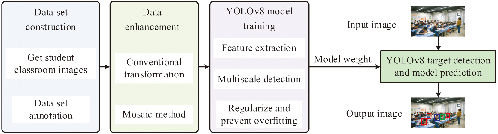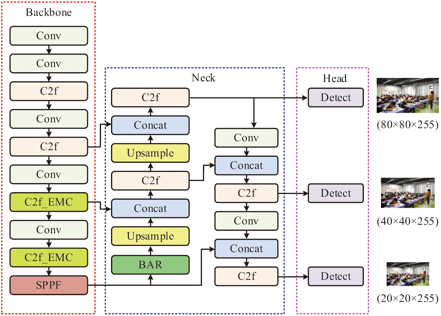 The use of contemporary information technology in the sphere of education is growing in popularity as education becomes more and more informatized. Classroom as the core place of teaching activities, its management and optimization has been an important topic of educational research. Traditional classroom management often relies on teachers’ subjective observation, making it difficult to realize real-time and comprehensive monitoring of students’ behavior [1,2]. Target detection (TD) technology based on computer vision has advanced significantly in several areas in recent years due to the ongoing development of deep learning (DL) technology, offering fresh approaches to this issue. The student classroom behavior detection (BD) system can monitor students’ classroom performance in real time and help teachers understand students’ concentration, classroom discipline, and potential safety hazards in a timely manner so that they can take appropriate measures to intervene [3,4]. Since it can effectively detect targets in real time, the you only look once (YOLO) family of models is frequently utilized in a variety of visual tasks [5]. YOLOv8, as the latest version of this series, combines more advanced network structure and algorithm optimization with stronger detection accuracy (DA) and speed [6]. However, despite its excellent performance in TD, YOLOv8 still faces some challenges when dealing with complex classroom environments, such as the under-detection problem of small TD and the difficulty of feature extraction (FE) due to target occlusion [7–9]. To overcome these problems, the study enhances the YOLOv8 model by adding the Shape intersection over union (IoU) loss function (LF) and the bidirectional attention refinement (BAR) attention machine mechanism, which improves the capacity to recognize student behavior in the classroom. The model’s focus on important features can be strengthened by the BAR attention mechanism, which can also increase FE accuracy and efficiency. To increase DA and recall, form IoU further optimizes the bounding box’s (BOB) degree of matching by taking into account the BOB’s scale and form. With these improvements, the study expects to build a more efficient and accurate student classroom BD system that can identify and classify multiple behavioral states of students in real time and accurately in a complex classroom environment.