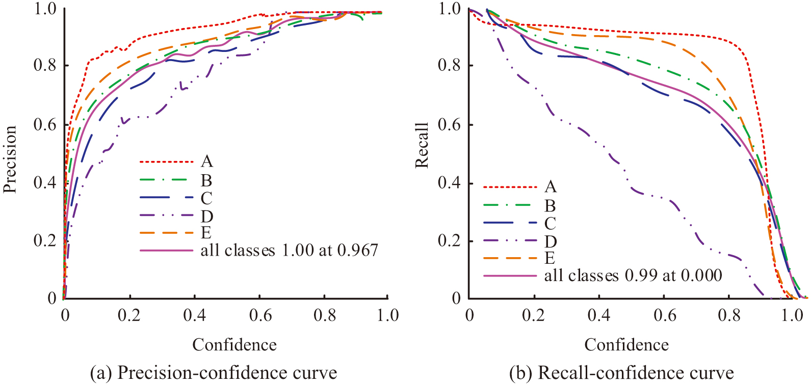 Fig. 6 shows the P and R curves of the model. In Fig. 6(a), the accuracy curves of different categories tend to be close to 1 in the high confidence region. It shows that the model’s prediction is more accurate at high confidence level (CL). At a CL of 0.967, the average accuracy of all categories reaches 1.00. That is, the model’s prediction is completely accurate at this confidence threshold. In Fig. 6(b), the recall curves of different categories are higher in the low confidence region, indicating that the model is able to identify more positive class samples at low confidence. At a CL of 0.000, the average recall of all categories reaches 0.99; that is, the model is able to identify 99% of the actual positive class samples at this confidence threshold. The model has high precision at high CL and high recall at low CL, indicating that the model maintains good performance at different confidence thresholds.