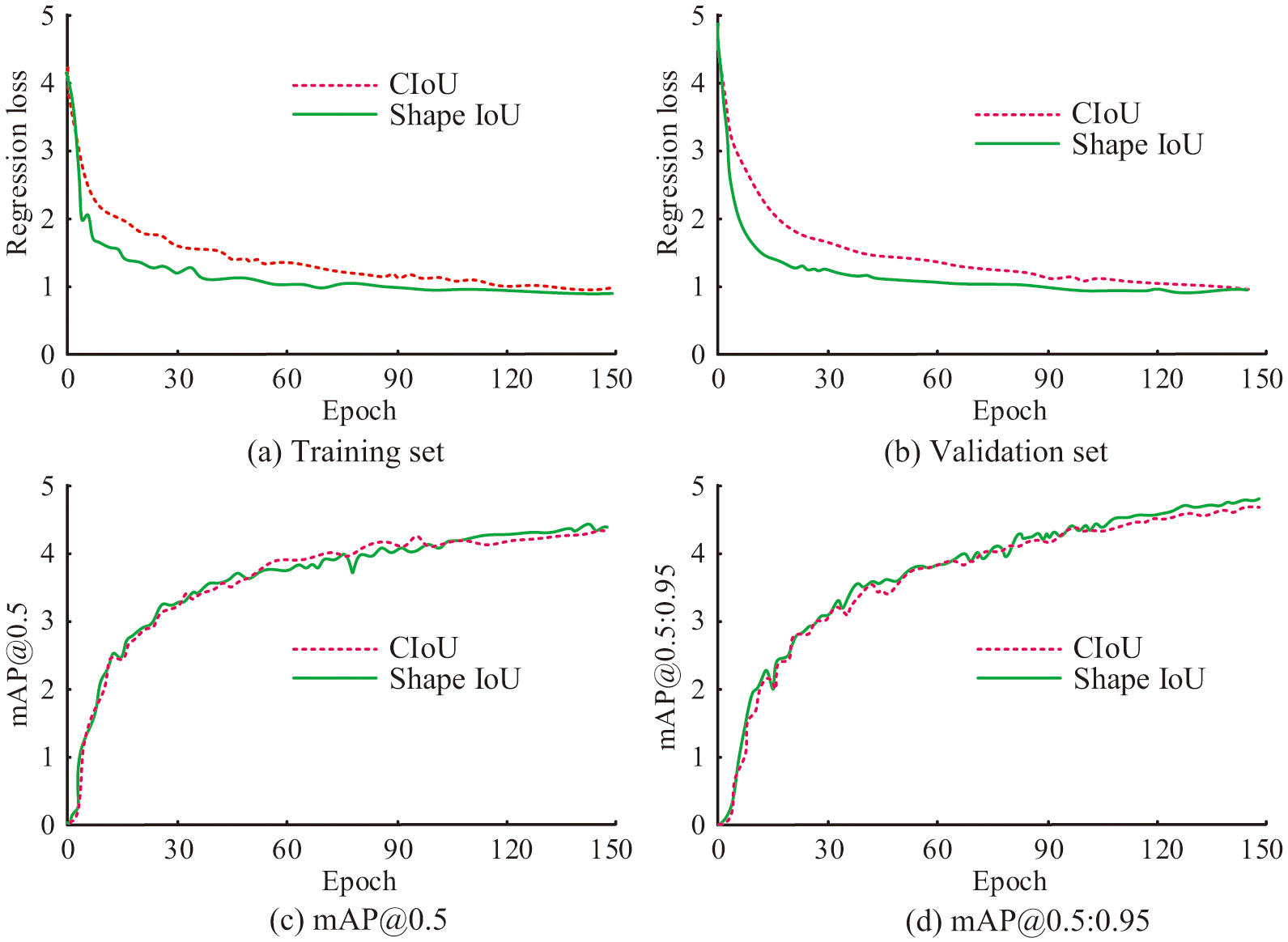 The experimental findings are illustrated in Fig. 7, and the study assesses the effect of various LFs applied to the YOLOv8 model’s performance under this created dataset. On the metric of model convergence rate, the YOLOv8 model incorporating the Shape IoU LF exhibits faster convergence characteristics than the original YOLOv8 model. At the level of DA, the YOLOv8 model incorporating the Shape IoU LF exhibits superior DA. This is because the Shape IoU LF achieves a fine-grained optimization of the match between the PF and the RF by introducing an auxiliary BOB and a scale factor. The improved LF not only considers the OLR but also focuses on the distance of key points between the PF and the RF, thus providing comprehensive spatial localization information. In addition, the Shape IoU LF’s design benefit is its capacity to handle TDs of various scales, which enhances the model’s adaptability to complicated situations and, consequently, the DA.