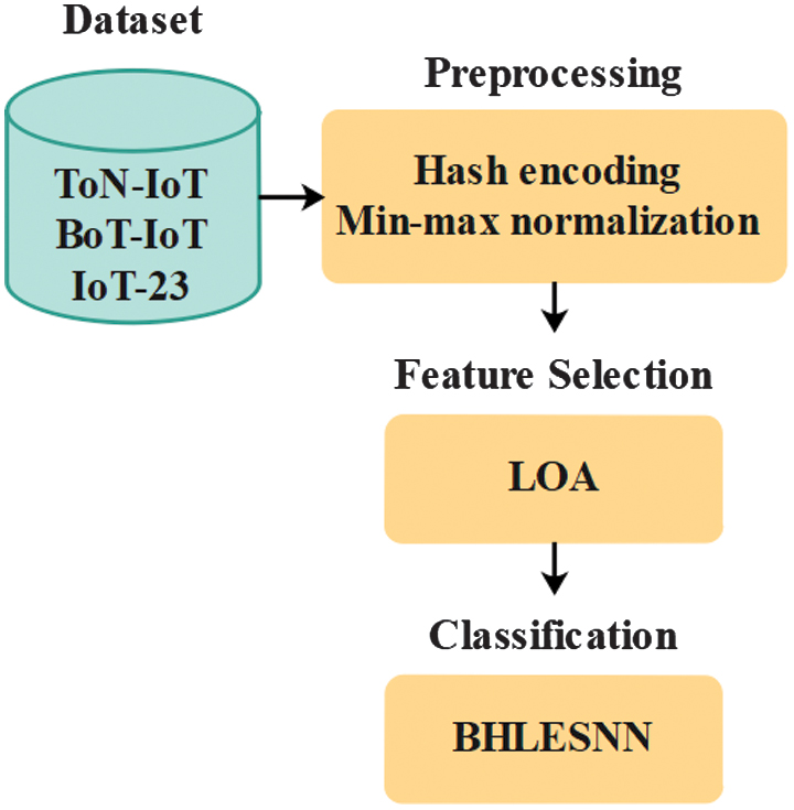 In this research, LOA-BHLESNN is proposed for a classification of IDS, which classifies the network traffic into multiple classes. Primarily, the three datasets, including ToN-IoT, BoT-IoT, and IoT-23, are considered to estimate the LOA-BHLESNN effectiveness. The hash encoding and min-max normalization are applied as preprocessing, which converts the categorical features into integer format, and then the features are normalized. The LOA is applied to select the best set of features through the exploration and exploitation stage. Finally, the selected features are given to BHLESNN to improve the classification accuracy. Fig. 1 shows the workflow of IDS.