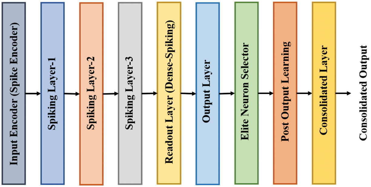 Fig. 3. Architecture of BHLESNN, including spike encoding, hierarchical spiking layers, elite neuron selection, and post-learning consolidation.
