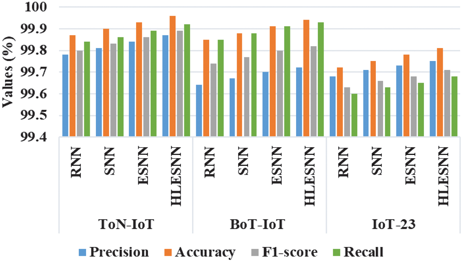 To analyze the model’s sensitivity to specific attack types, Table VI–VIII presents class-wise performance of the proposed LOA-BHLESNN on the Ton-IoT, BoT-IoT, and IoT-23 datasets, respectively. In this research, no new or synthetic attack types are created. The analysis is performed on the specific attack types already included in the datasets, such as Ton-IoT, BoT-IoT, and IoT-23. By reporting precision, recall, and F1-score for each of the attack classes, the model’s sensitivity and robustness against various threat types are demonstrated. Table VI illustrates the results of the suggested model on the ToN-IoT dataset on its 11 categories and recounts the precision, recall, and F1-scores, which showed fine values. The majority of the classes show above 99.7% of results across all the metrics, meaning that they are quite strong in terms of robustness in separating benign and wide varieties of attacks. Attack patterns that are related or similar, such as DDoS, DoS, injection, and XSS, are labeled with close to 100% precision. The model is displayed to have an outstanding generalization to different categories of threats. Overall, it achieves the mean recall of 99.92%, the mean precision of 99.87%, and an F1-score of 99.89% securing high-scale intrusion detection of IoT.