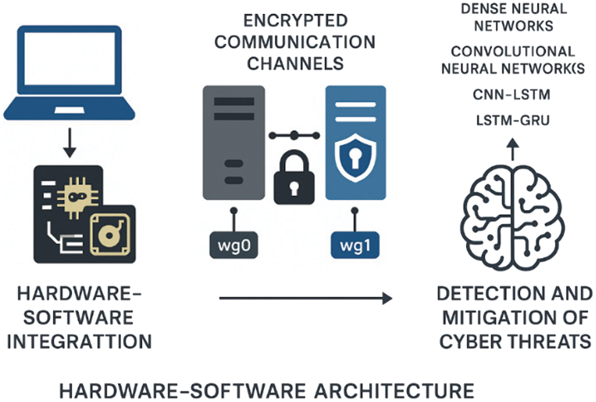 While this work primarily focuses on DL-based threat detection, secure data handling is crucial during both the training and deployment stages in sensitive environments, such as healthcare. Hardware–software architecture is implemented to support secure communication channels and facilitate the routing of cryptographic keys. The system leverages WireGuard, a lightweight and modern VPN protocol, to establish encrypted tunnels between network nodes. These secure interfaces (e.g., wg0 and wg1) operate on top of conventional interfaces and are configured via standard tools such as ifconfig, ip, and route. WireGuard associates each peer with a public key and an internal IP address, allowing only authenticated devices to exchange data. The wg utility facilitates real-time configuration and monitoring of the encrypted channels. This infrastructure complements the ML and DL models by safeguarding data integrity, confidentiality, and compliance during experimentation and operational deployment. This setup provides a lightweight, scalable, and cryptographically sound communication framework that complements the DL models by ensuring data integrity and confidentiality during both model training and real-time operation. The entire framework is illustrated in Fig. 1.