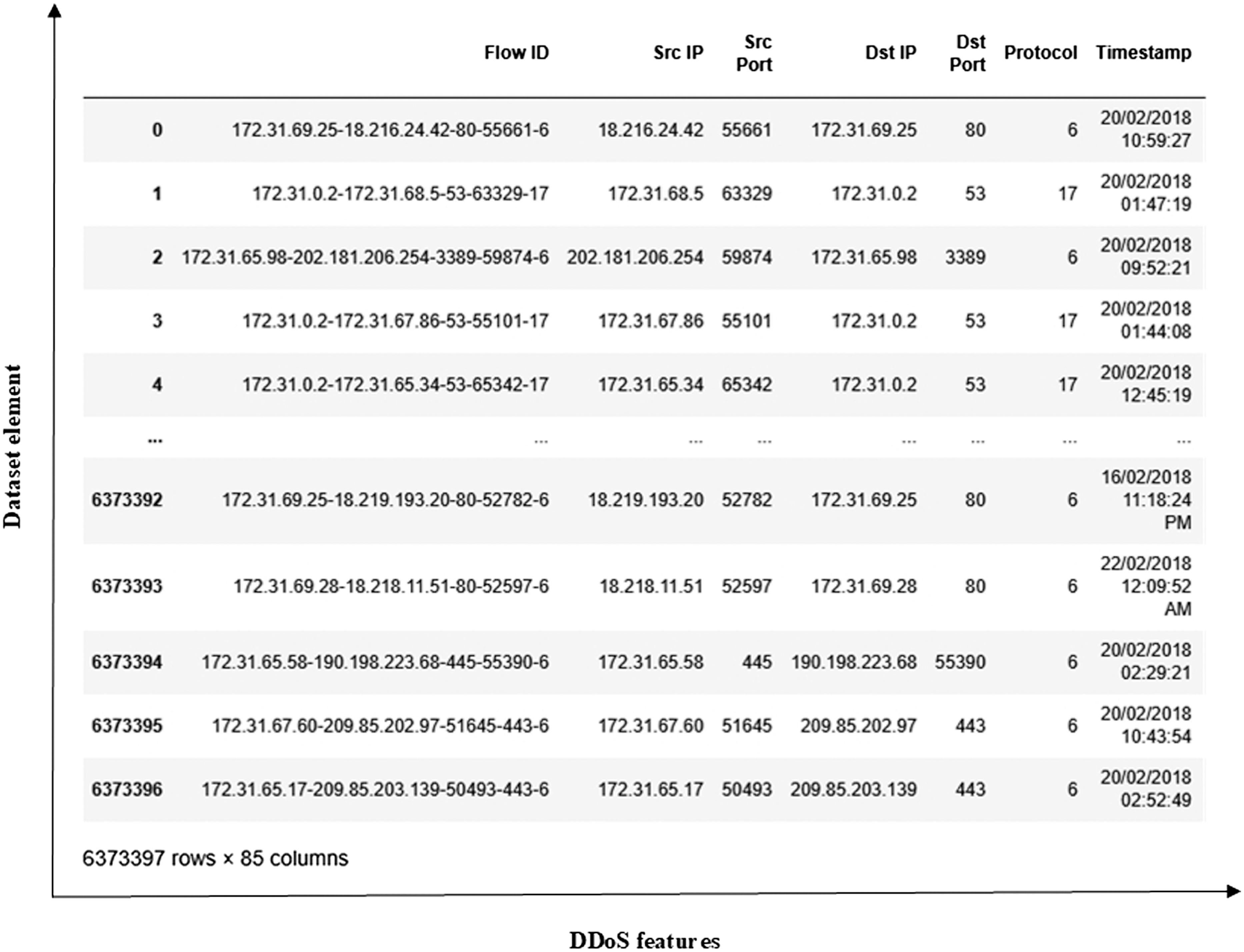 The DDoS dataset (https://www.kaggle.com/code/taruntambrahalli/ddos-nbc) is a comprehensive collection of various attacks compiled from CICDoS2016, CICIDS2017, and CIC-IDS2018 sources. These datasets are created in different years using diverse DDoS traffic generation tools. The extracted DDoS flows are then combined with benign traffic, which is separately extracted from the same original datasets, to create a single, unified dataset. The features of the dataset contain comprehensive information about IP addresses, ports, sizes of data packets, etc. The whole dataset includes 6373397 elements and 84 features. The whole DDoS dataset is shown in Fig. 2.