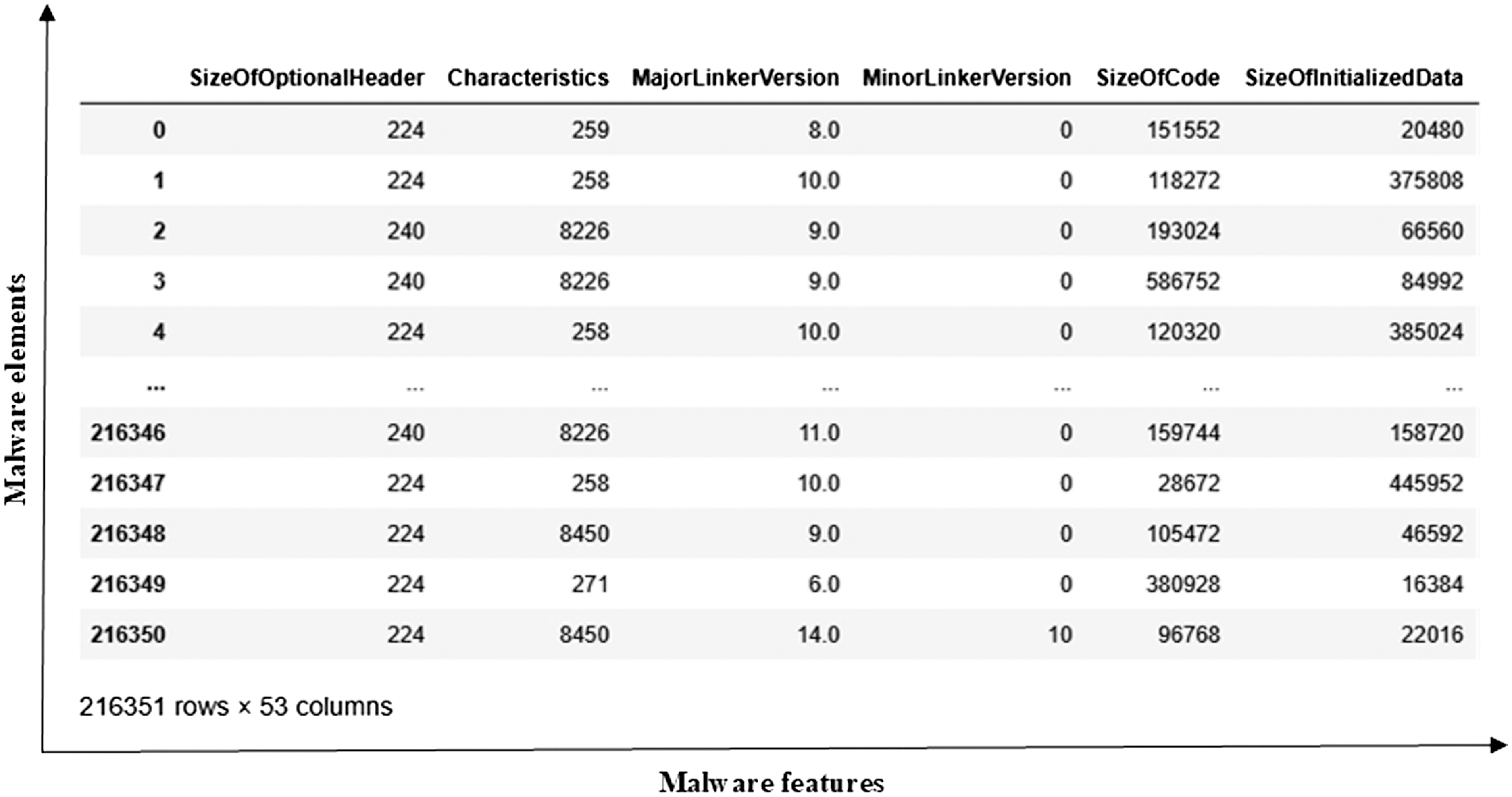 The malware dataset (https://github.com/saurabh48782/Malware_Classification/blob/master/MalwareData.csv) is designed for binary classification of malicious and benign objects. This dataset is adaptable for different DL algorithms for malware detection. Malicious software poses significant threats to information systems. There is a large variety of malware, such as worms, viruses, trojans, and others. The entire dataset comprises 216351 malware elements and 53 features. It is shown in Fig. 4.