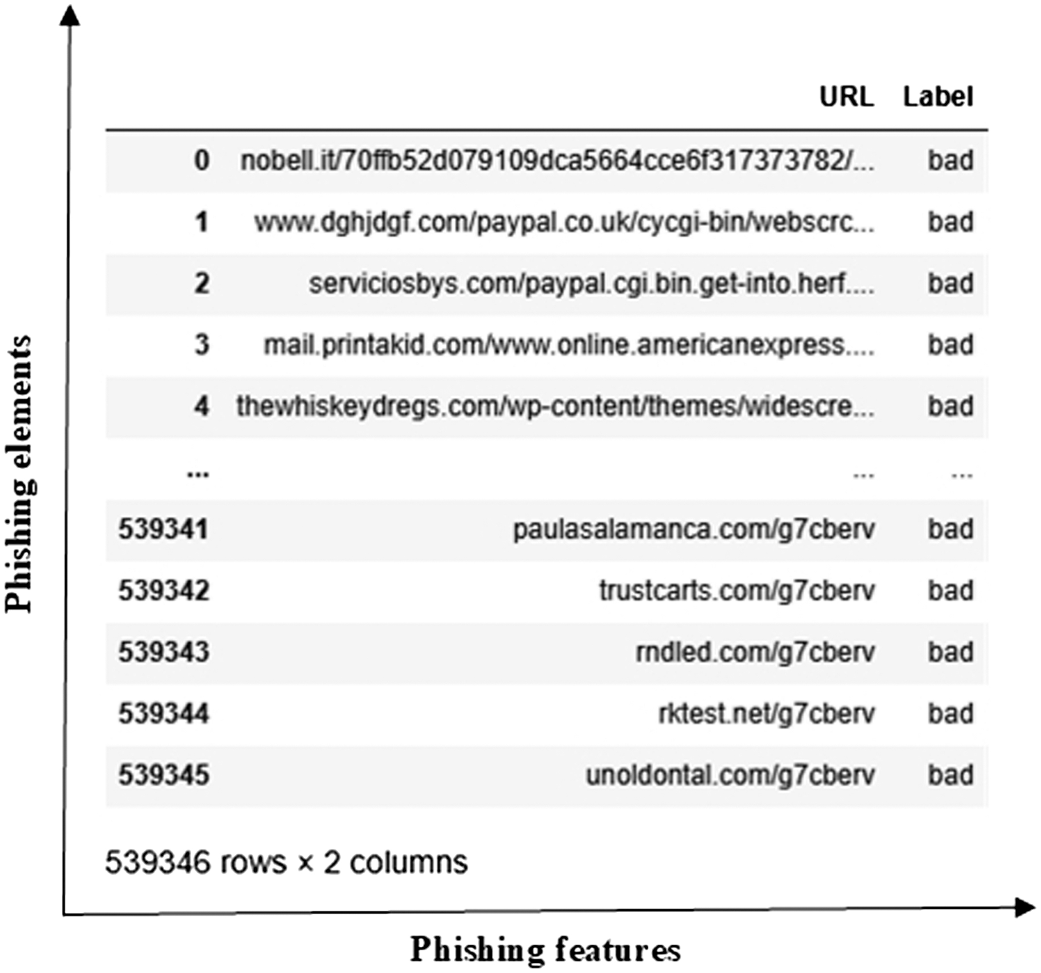 The phishing dataset (https://www.kaggle.com/datasets/taruntiwarihp/phishing-site-urls) is a substantial resource for developing and testing ML and DL models to detect phishing websites. It comprises approximately 549346 elements, each consisting of a URL and a corresponding label indicating whether the site is legitimate or a phishing attempt. The dataset’s data structure includes a URL (the web address to be analyzed) and a Label (the URL classification, where 0 denotes a legitimate site and 1 indicates a phishing site). The dataset is shown in Fig. 5.