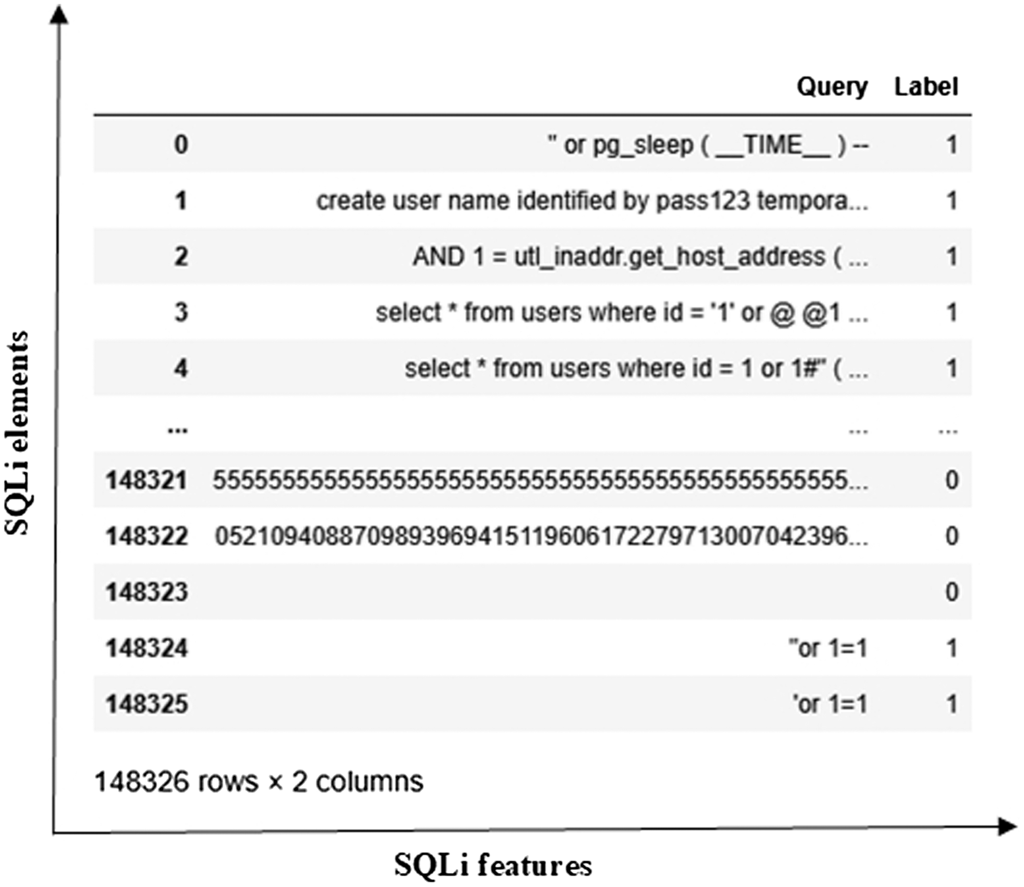 The SQLi dataset (https://www.kaggle.com/datasets/gambleryu/biggest-sql-injection-dataset) is designed to support research and development in the detection of SQL attacks. The corresponding dataset is effectively used to train advanced DL models aimed at identifying SQLi patterns. This dataset includes the Query and Label columns, consisting of 148326 elements. The dataset is shown in Fig. 6.